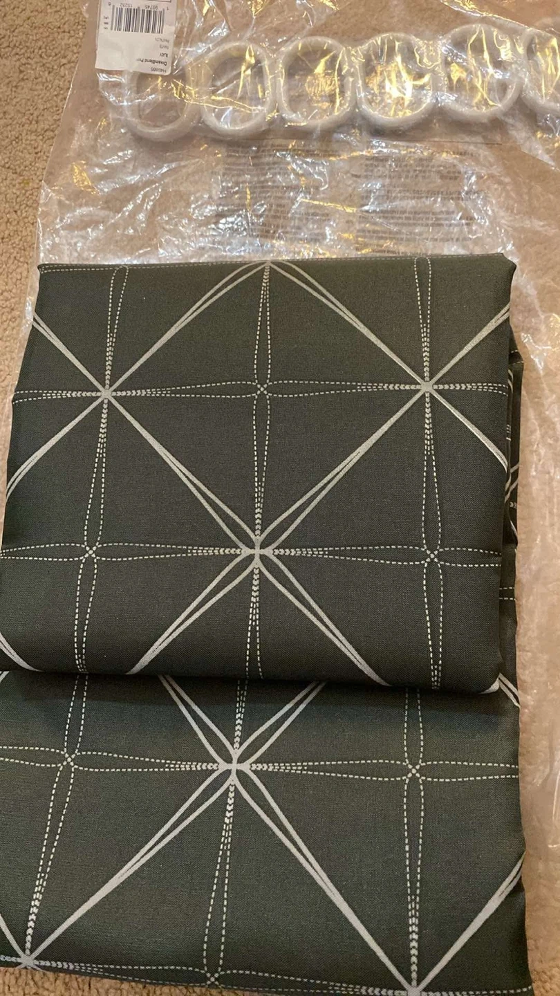 Shower curtain with a black diamond pattern. Comes with the curtain rings as shown in the picture. Great for adding a touch of modern design to any washroom!