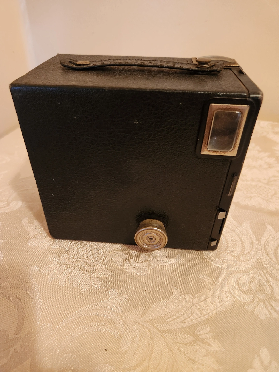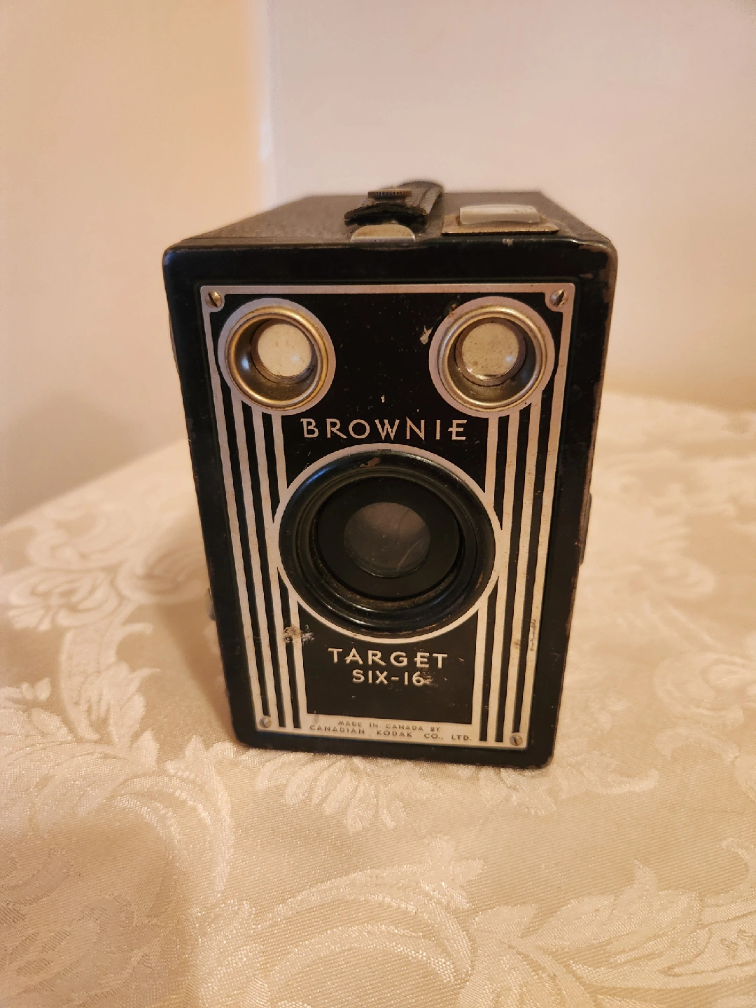 Selling a vintage Kodak Brownie Target Six-16 camera. It's a classic piece of photographic history! It shows some signs of wear consistent with its age, but it's a cool collectible item. it also includes 2 Kodak plushies.