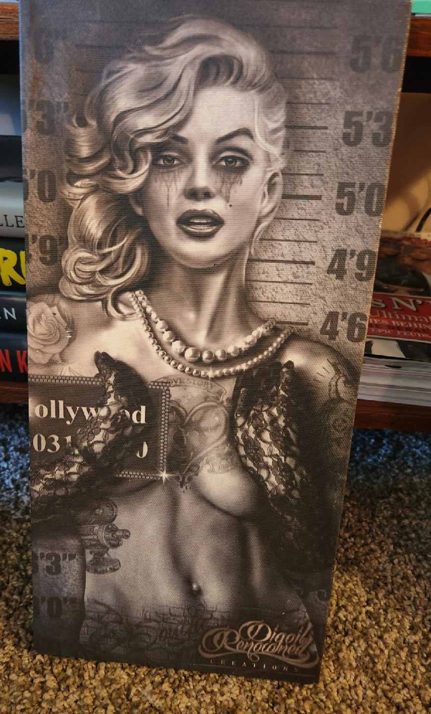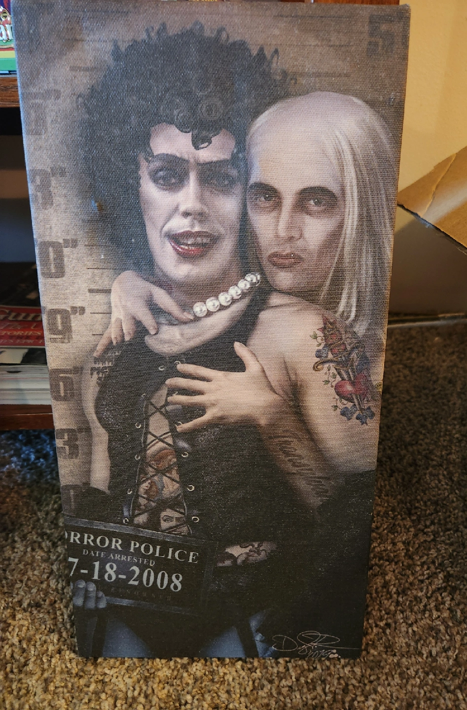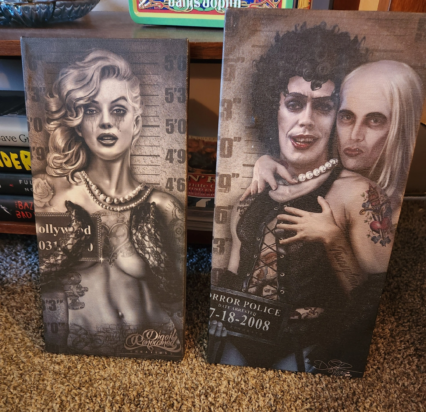 Two canvas art pieces featuring Marilyn Monroe and characters from the Rocky Horror Picture Show. The Marilyn Monroe canvas has "Hollywood 0310" and the Rocky Horror Picture Show canvas has "Horror Police Date Arrested 7-18-2008". Both are in great condition!