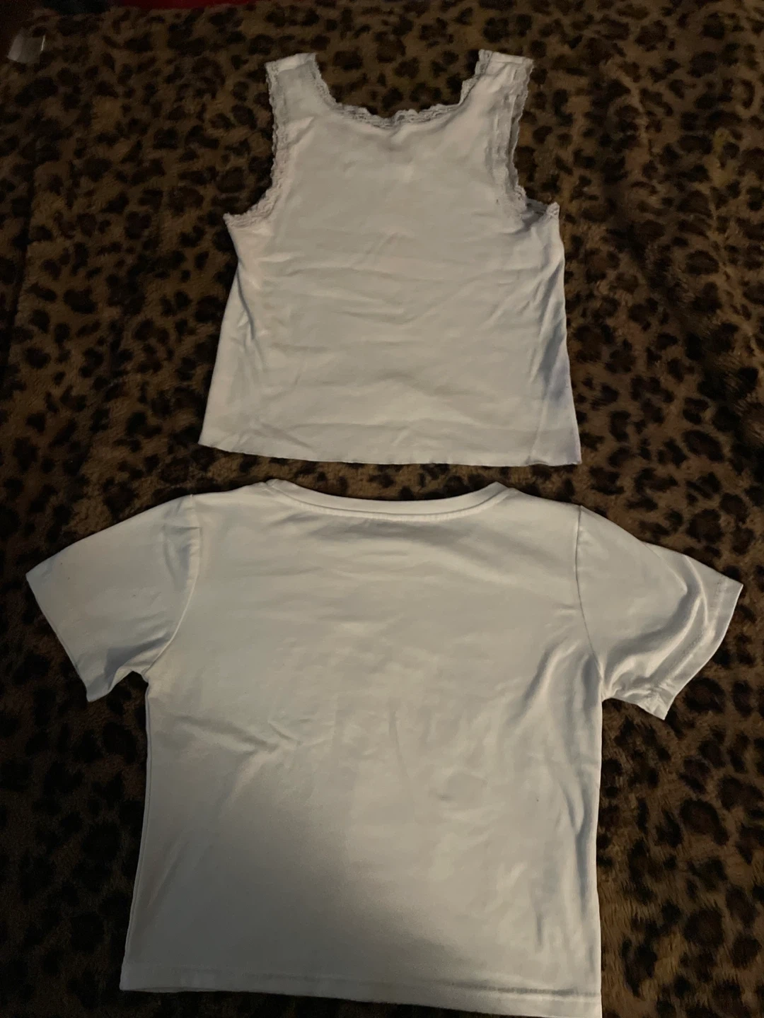 pick up only! :) not sure the brand of the tee but it's a size small the lace detailed tank is from john galt and is a size xs