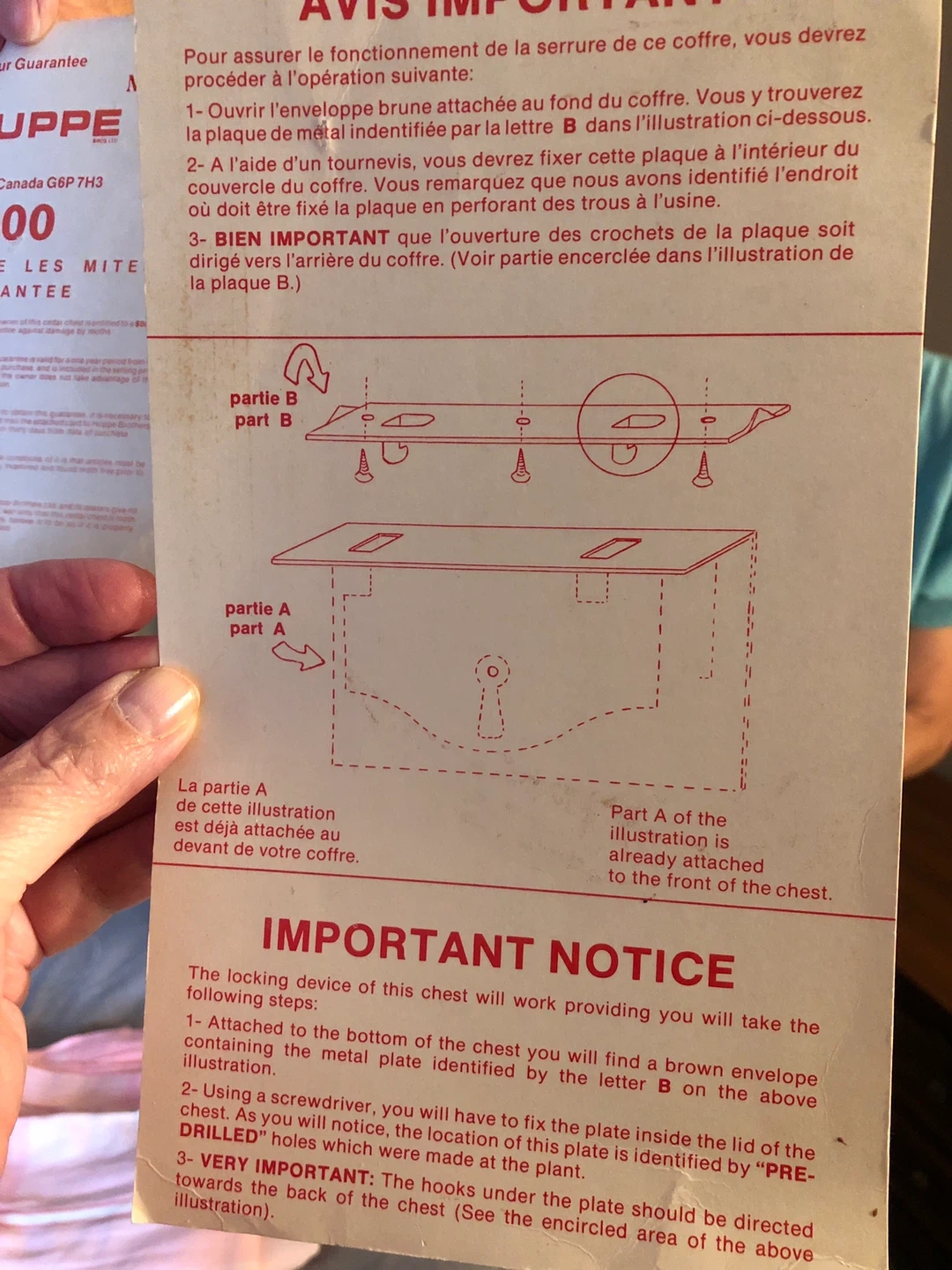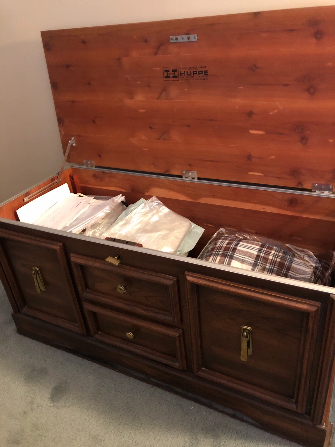 Selling a Huppe cedar chest. It's in good condition and perfect for storing blankets, linens, or other items. The chest has a beautiful wood finish and a classic design that would complement any room. Includes the original instructions.