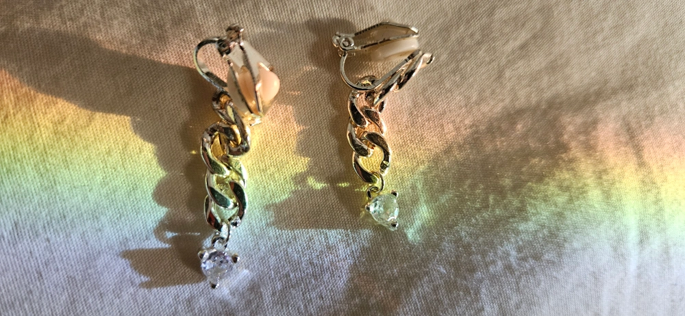 Selling a pair of clip-on earrings! They feature a chain design with a cute little rhinestone at the bottom. Perfect for adding a bit of sparkle to any outfit!