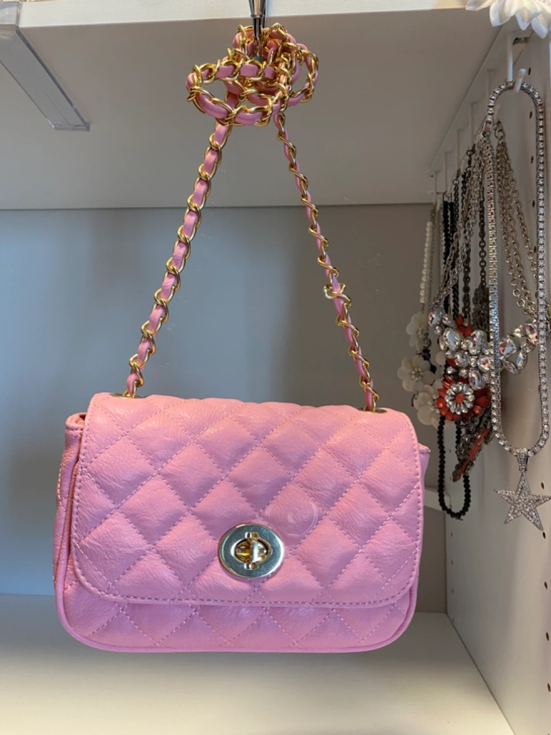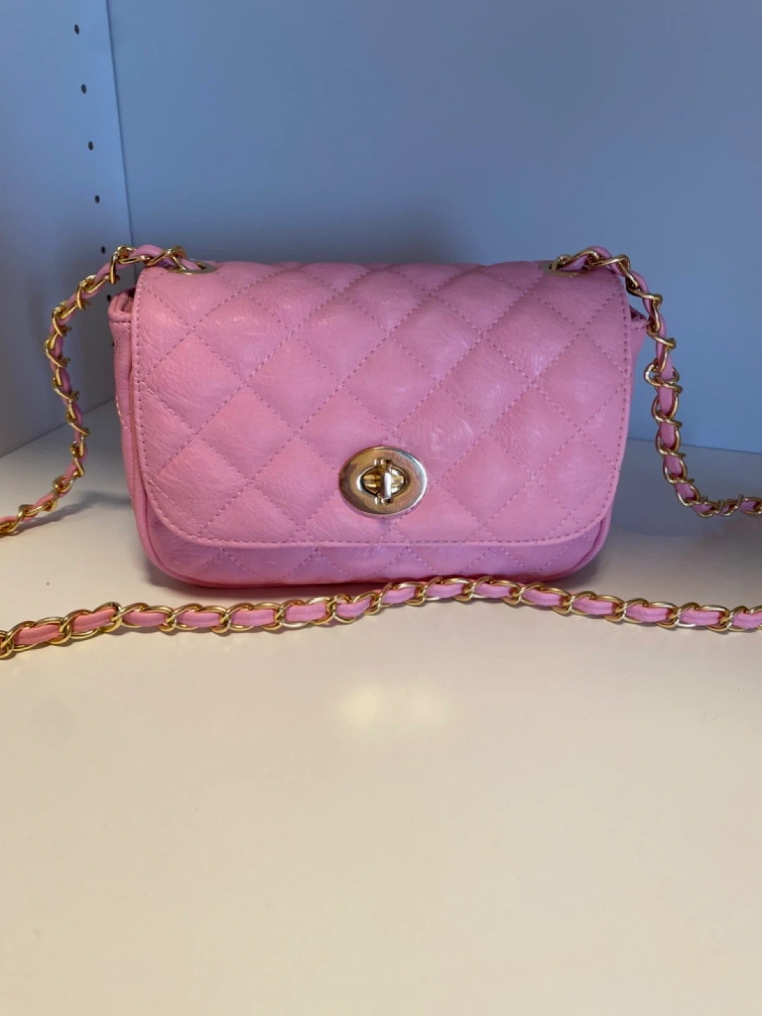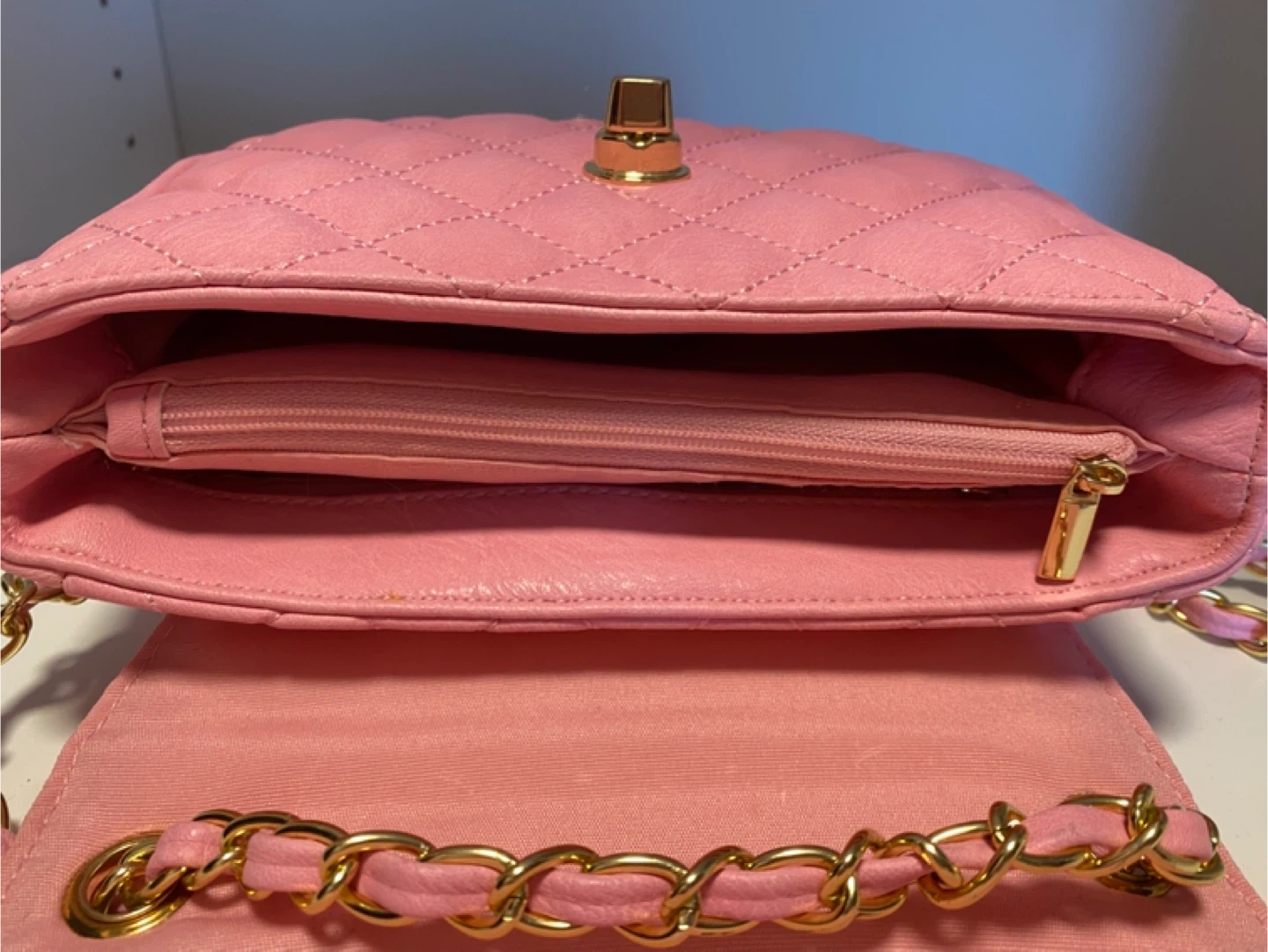 New Quilted Plush Aldo crossbody bag! It's a lovely shade of pink with a quilted pattern and a gold chain strap. Perfect for adding a pop of colour to any outfit. The interior is also pink and includes a zippered pocket for your valuables