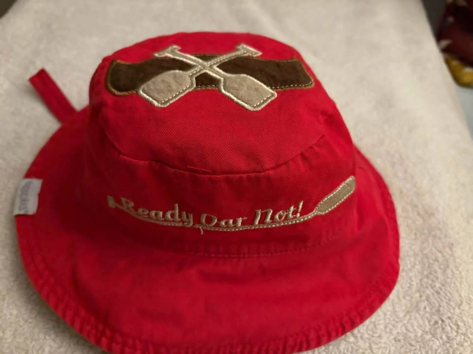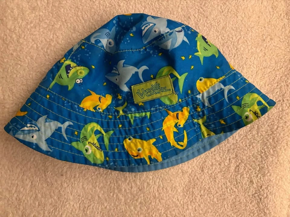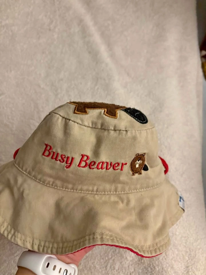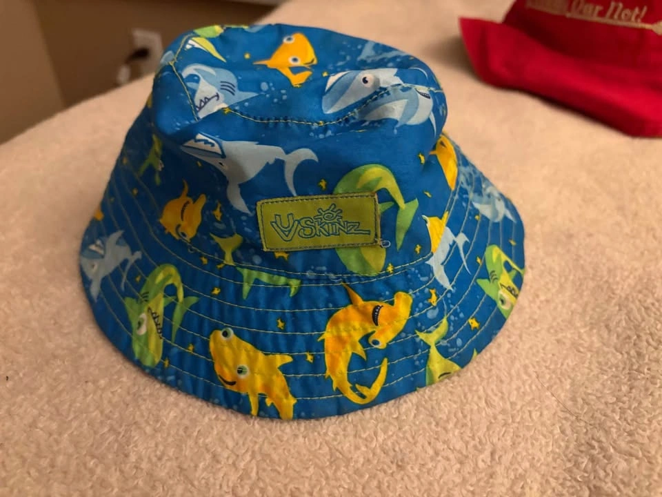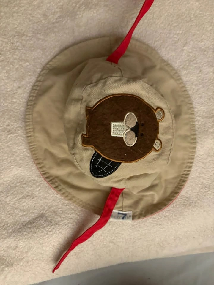2 reversible sun hats. Good for age 6 months to 2 years. Pick up heritage mountain. Here are the details for the flapjack hat (beige /red) - retails for $23 for just this one. • 2-in-1 reversible kids' bucket hat design • Reversible chin straps that feed through eyelets • 100% cotton • UPF 50+ • Small: 6 months-2 years (20" circumference)