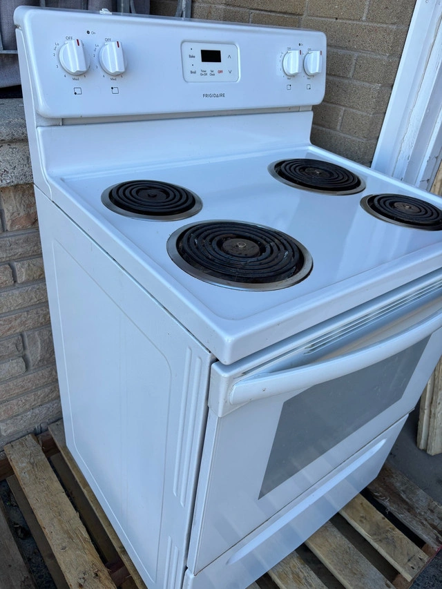 This is a used Frigidaire stove with coil top elements. It's in good working condition, perfect for anyone looking for a reliable and straightforward appliance. It has the usual marks of use, but nothing that affects its performance. Specifications: * Brand: Frigidaire * Type: Electric Stove * Top: Coil Elements * Colour: White Dimension: 47”x30”x28” (HxWxD) if the ad is up, it's available! Pickup only
