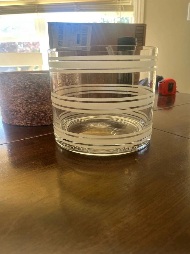 This 7” x 6” glass decorative vase features a stylish design with horizontal stripes, perfect for adding a touch of modern elegance to any room. This item is used but in good condition. Specifications: * Dimensions: 7 inches in height, 6 inches in diameter * Material: Glass * Design: Horizontal stripe pattern * Condition: Used, but well-maintained