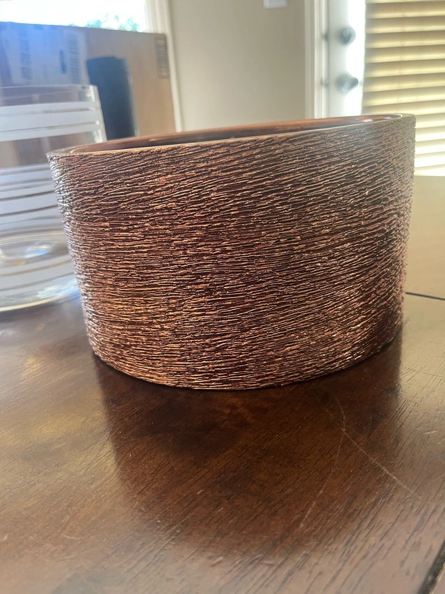 This is a used designer planter with a unique textured, metallic finish, perfect for adding a touch of elegance to any room or garden. The planter is in good condition, showcasing its distinctive design and quality craftsmanship. * Material: Durable composite * Finish: Metallic * Suitable for indoor use If the ad is up, it's available!