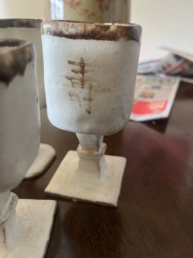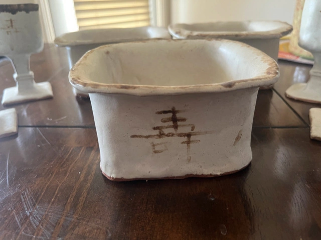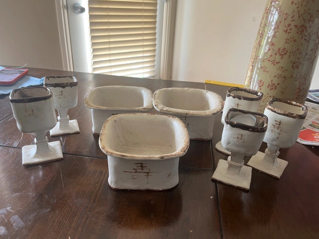 This set of unique Asian-inspired pottery pieces includes small vases or vessels, all in a rustic, off-white glaze with character markings. Each piece features its own distinct shape and design. These are used items and may have some minor imperfections that add to their charm. They are perfect for adding an artistic touch to any space.