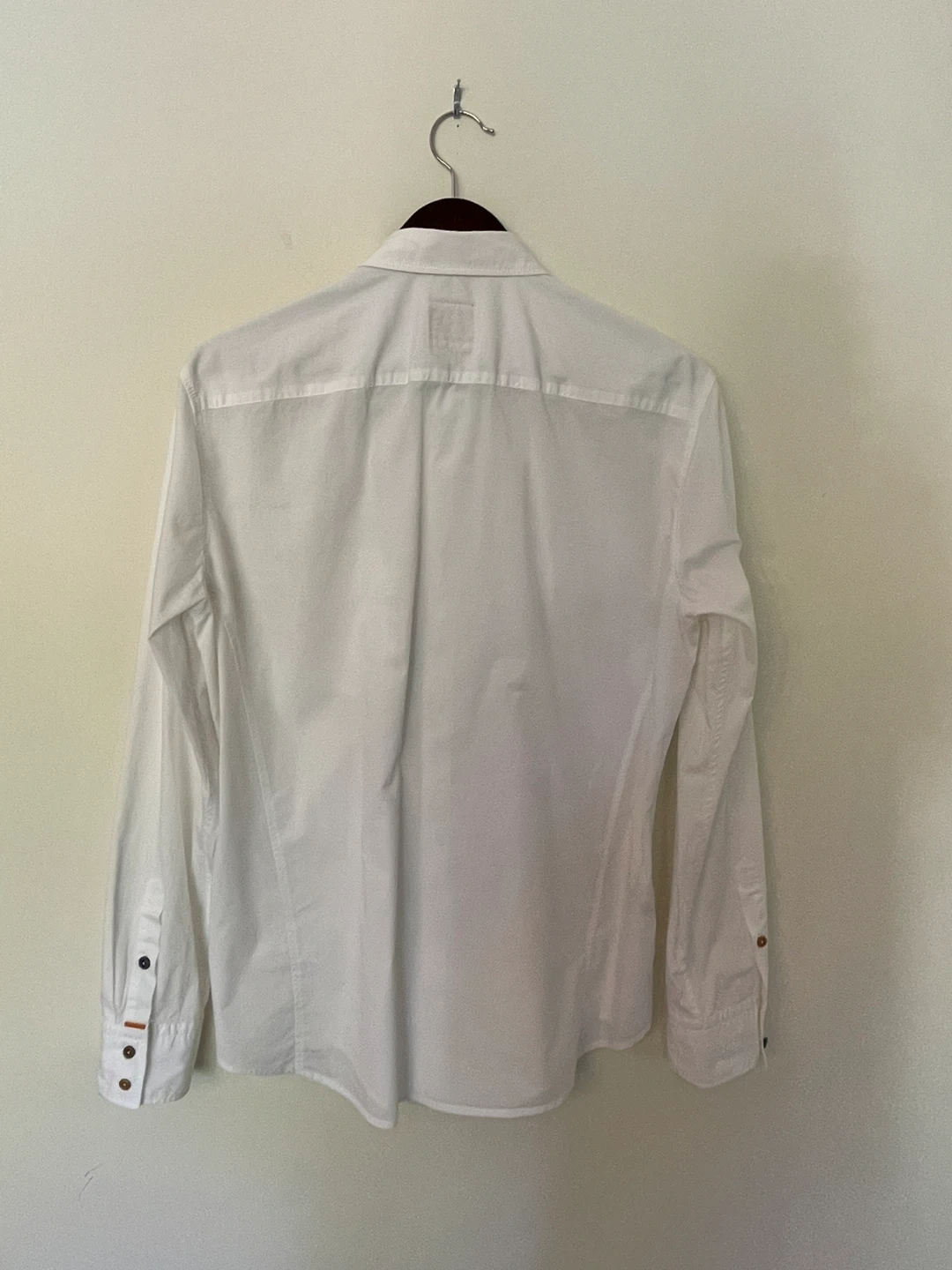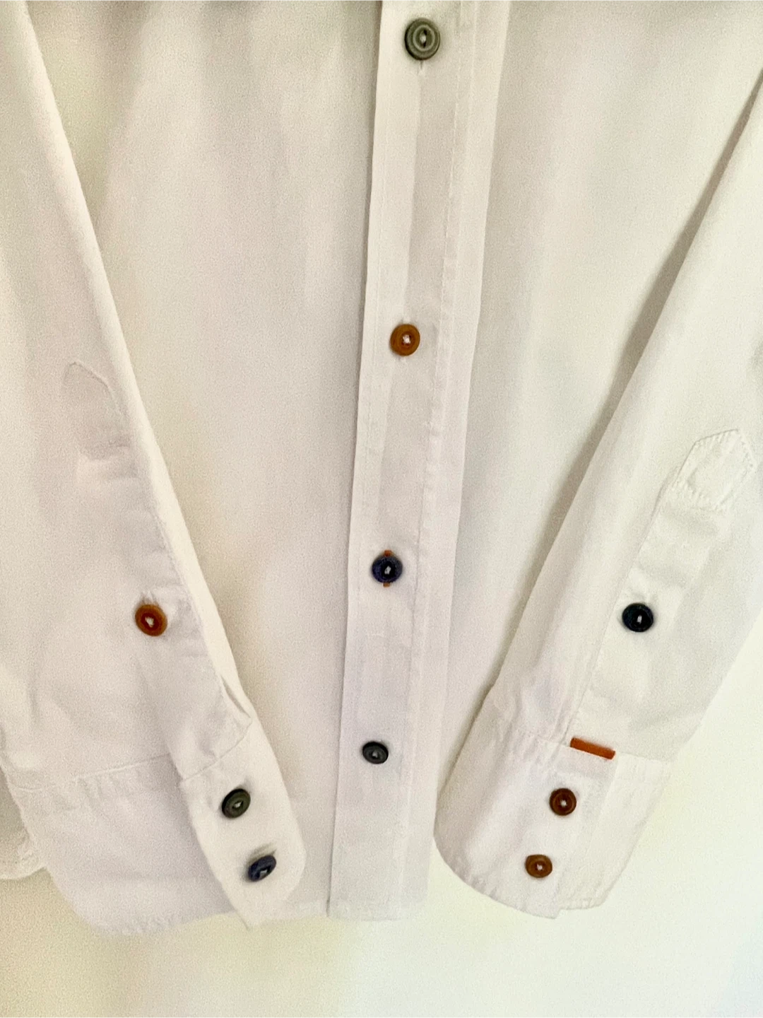 Here's a stylish BOSS Orange button-up shirt in white! It features unique multi-coloured buttons and two front pockets. Perfect for a casual yet put-together look. $30.00 cash only please Very good to excellent used condition Freshly laundered Smoke free pet free home Mississauga Road & QEW Please see what else I have for sale Thank you!
