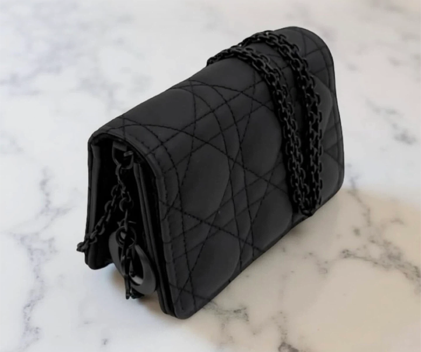 Selling a Dior Lady Dior chain wallet in matte black! It's in great condition and comes with a chain strap. CD Chain Pouch (mini size) Black ultra matte quilt calfskin with BHW Condition: 9.5/10 - minor wear Dimensions: approx. 5 x 2 × 3.5" Strap Drop: approx. 21" Details: can be worn as belt bag Includes dust bag and third party authentication