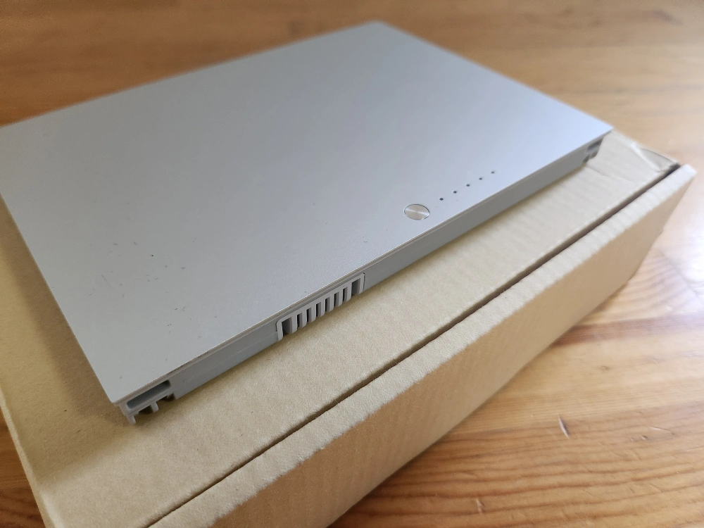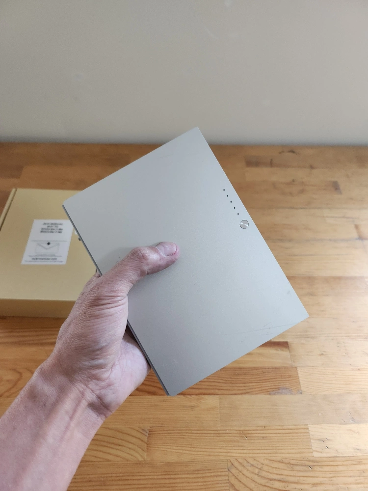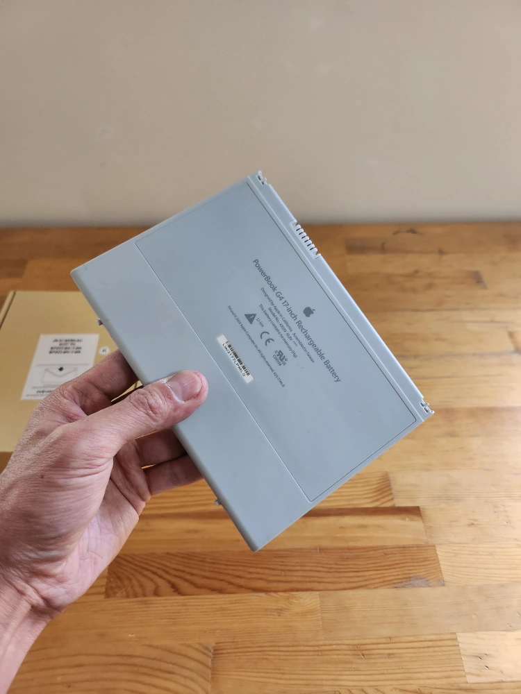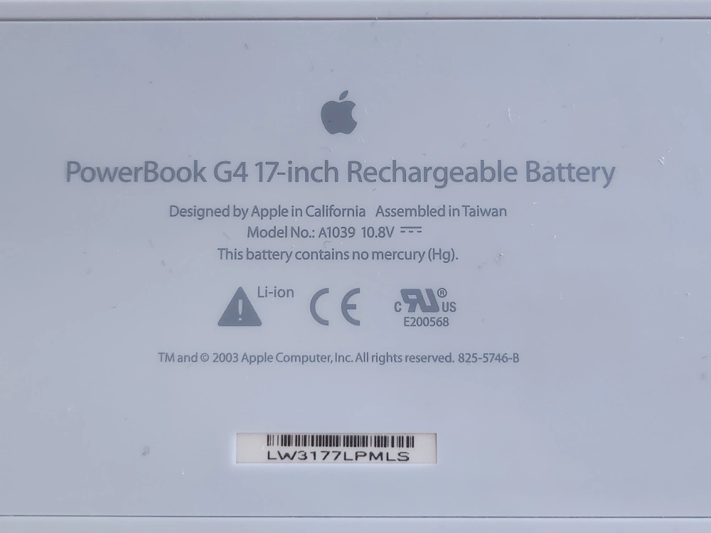 Apple PowerBook G4 17-inch rechargeable battery. Great to have in a pinch if your experiencing low battery and have no outlet nearby! The box is included. Model No.: A1039 10.8V.