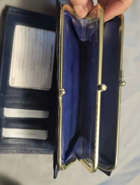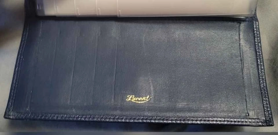 A unique opportunity to own a vintage Lucent wallet, brand new and never used. This rare piece combines a classic quilted navy design with elegant gold accents and the iconic Lucent emblem on the front flap. A true collector’s item for anyone who loves timeless accessories. ✨ Features: Brand: Lucent Style: Vintage, rare find Condition: New, never used (see note below) Color: Navy blue with gold hardware Quilted front with smooth faux leather body Multiple compartments for cash, cards, and coins Secure clasp closure Elegant yet practical – perfect for collectors or everyday use ⚠️ Note: Due to age, there is some minor cracking on the inside pocket. The outside remains in perfect condition, making it an excellent display or usable piece.