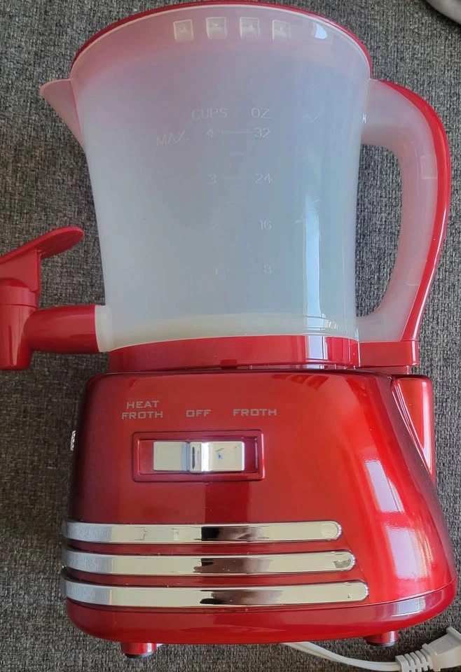 Mint condition! Make rich, frothy hot cocoa, lattes, mochas, and more right at home. The heated base warms and whips drinks in minutes, while the retro red and chrome design looks great on any countertop. ✅ 32oz pitcher for multiple servings ✅ Dripless 2-way faucet – single cups or mugs, no mess ✅ Heat & Froth or Froth Only settings ✅ Removable pitcher with easy-pour spout for quick cleaning Enjoy gourmet hot or iced drinks with café-style froth—right in your kitchen!