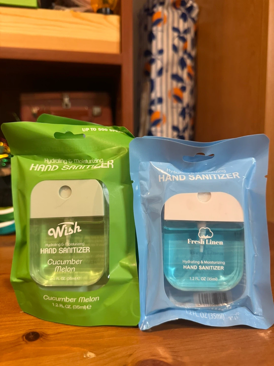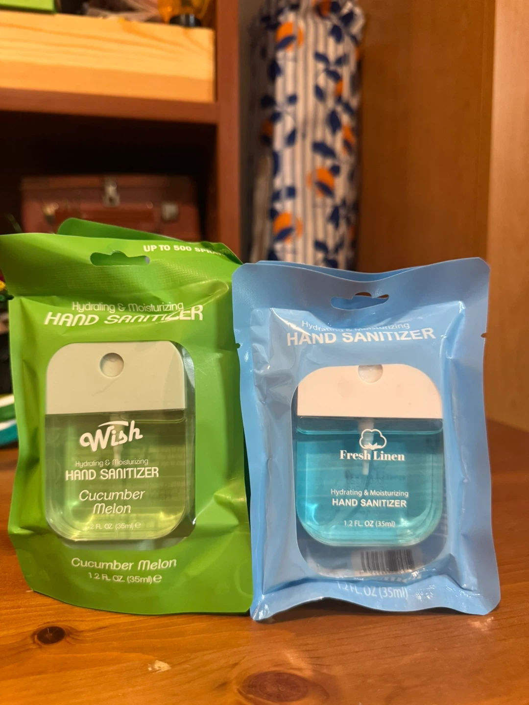 Selling two hand sanitizers: one Wish Cucumber Melon and one Fresh Linen. Both are hydrating and moisturizing, and each contains 1.2 fl oz (35ml). Perfect for keeping your hands clean on the go! $6ea