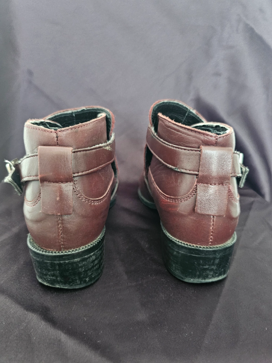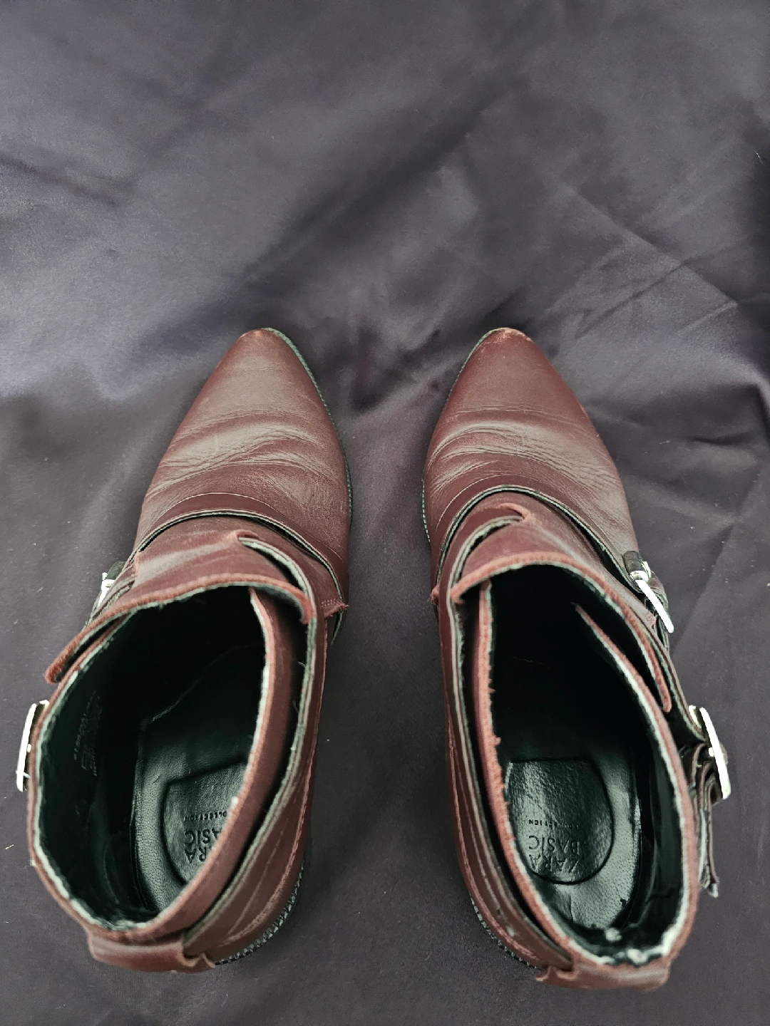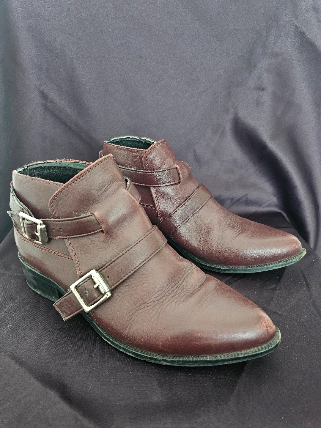 Selling a pair of used Zara ankle boots in burgundy color. They feature are in good condition. Can be refreshed with a quick stain and polish. Size 6 $20 Open to offers Pick up only Cash only near WESTON GO/UP train station