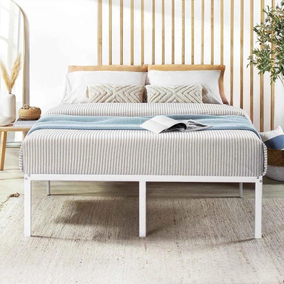 Brand new bed frame in sealed box with all parts for easy assembly. Only the bed frame for sale. Mattress not included. 18 Inch Metal Platform Bed, Heavy Duty Steel Slats, No Box Spring Needed, Easy Assembly, White, King Product details: Brand: Mellow Size: King Style: 18 Inch height Material: Metal Product Dimensions: 2.02L x 1.92W x 0.46H Meters Item Weight : 19.84 kg Ground To Item Distance: 14 Inch Special feature: Squeak Resistant Colour: White Metal platform bed with steel slat support, no box spring needed Durable and noise-free construction made with heavy duty steel and foam padding between the center bar and the slats Additional legs and center bar increase points of contact to the floor for sturdy support High profile provides 14 inches of vertical clearance for convenient under bed storage space Easy assembly in minutes with no additional tools required