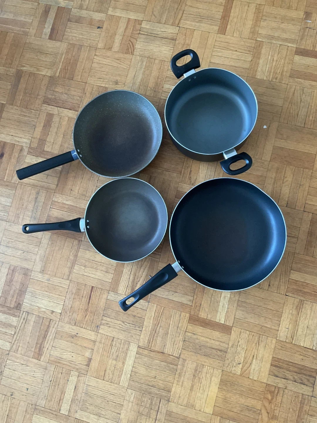 Selling a set of used frying pans and a pot. They've got some wear and tear, but they're still good for cooking up a storm! Perfect for someone just starting out or needing some extra cookware. 5$ each or take all in 12$.