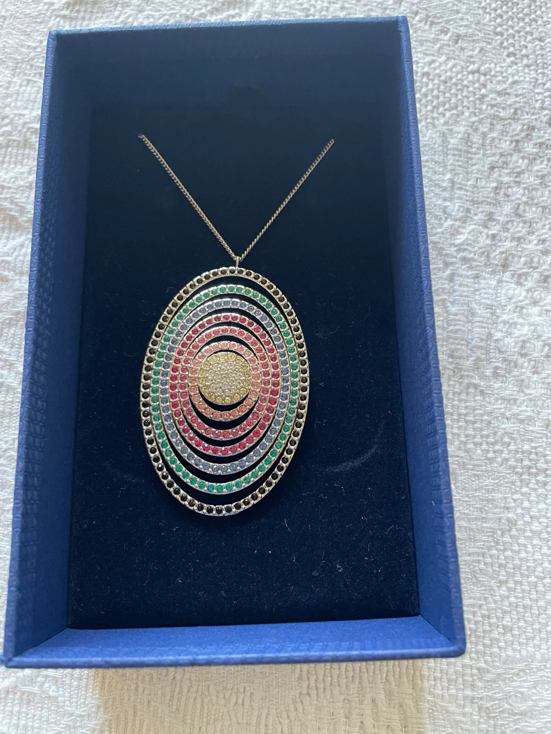 Selling a lovely Swarovski pendant necklace. It comes with its original box. The pendant features a colourful, concentric circle design with sparkling crystals. It's in excellent condition and ready to add a touch of elegance to your style