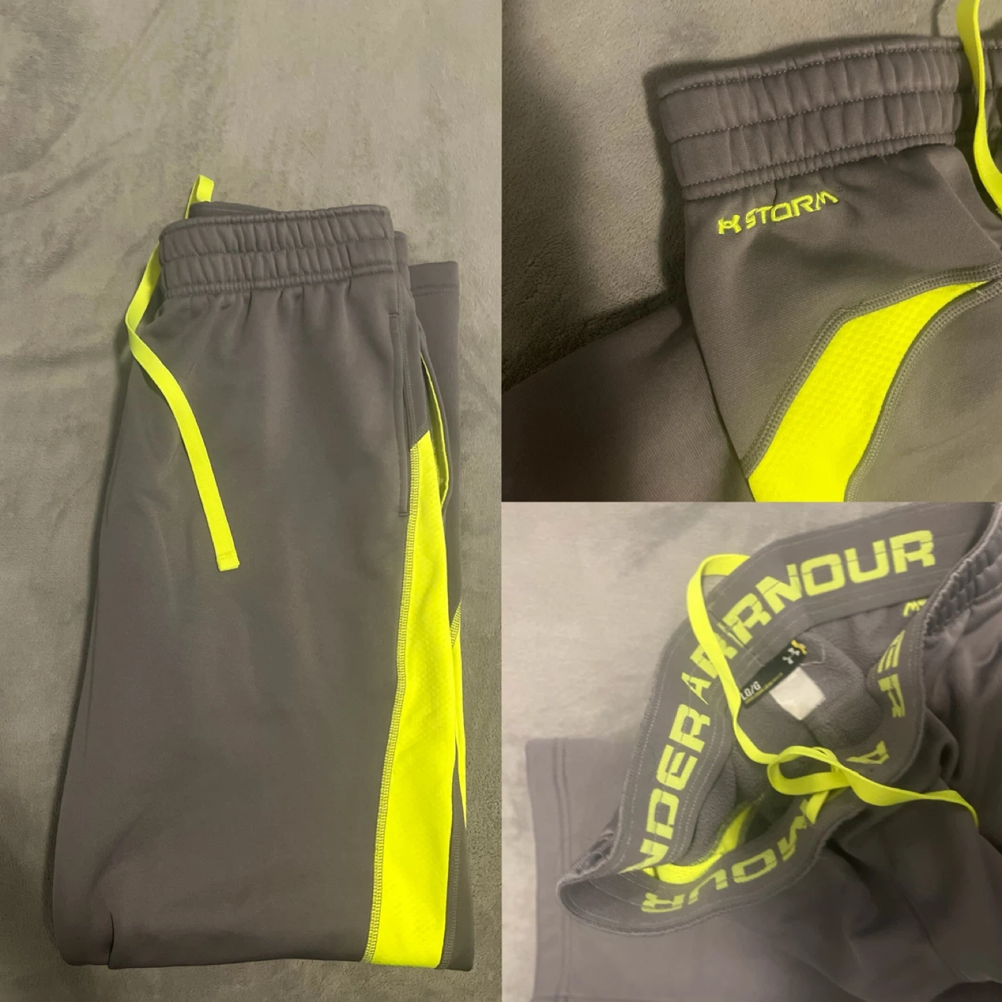 Selling a pair of Under Armour Storm pants in size large. They are gray with yellow accents and in great condition. Perfect for workouts or just lounging around!