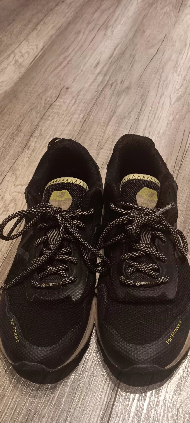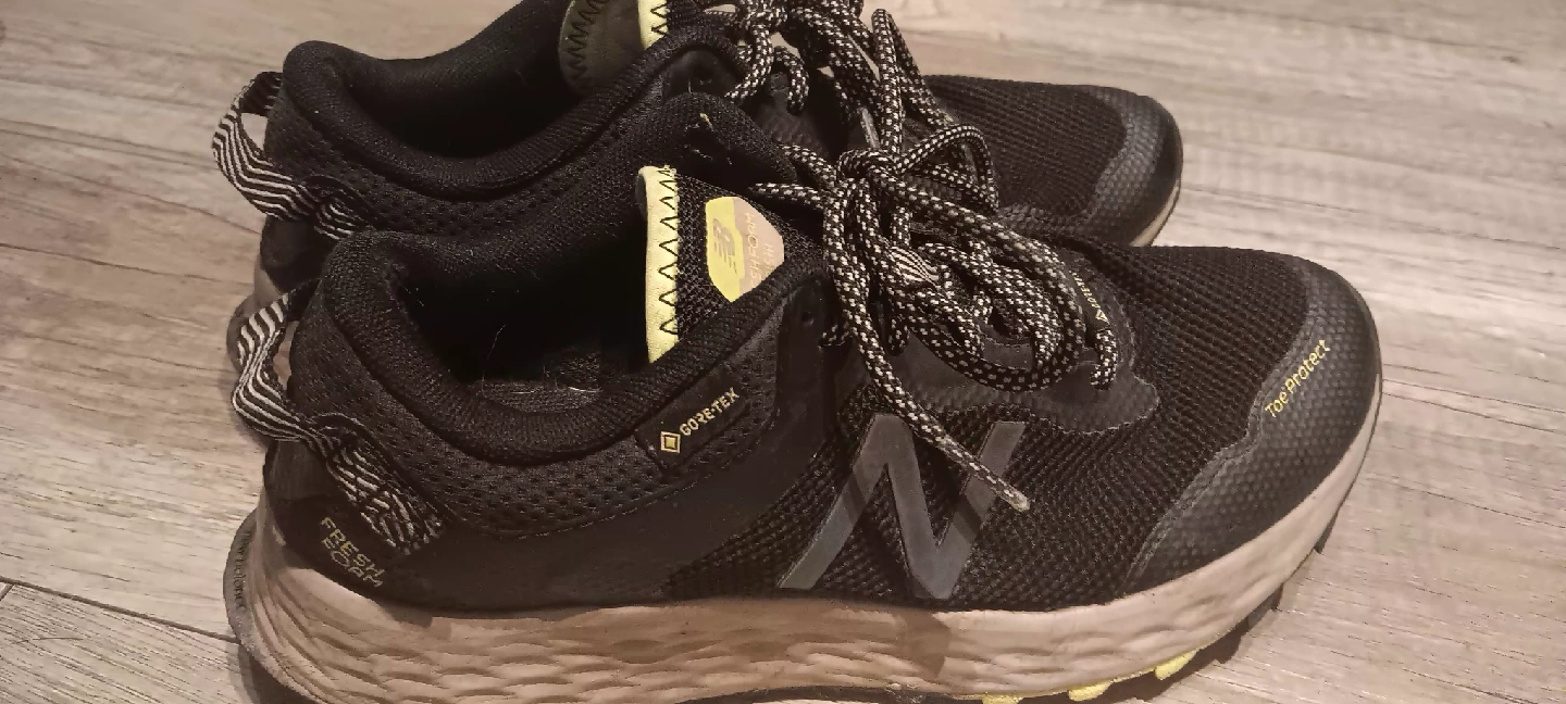 Selling a pair of New Balance Fresh Foam trail shoes in black. They feature GORE-TEX for added protection and have 'Toe Protect' reinforcement. These shoes are great for hitting the trails! size 7 women
