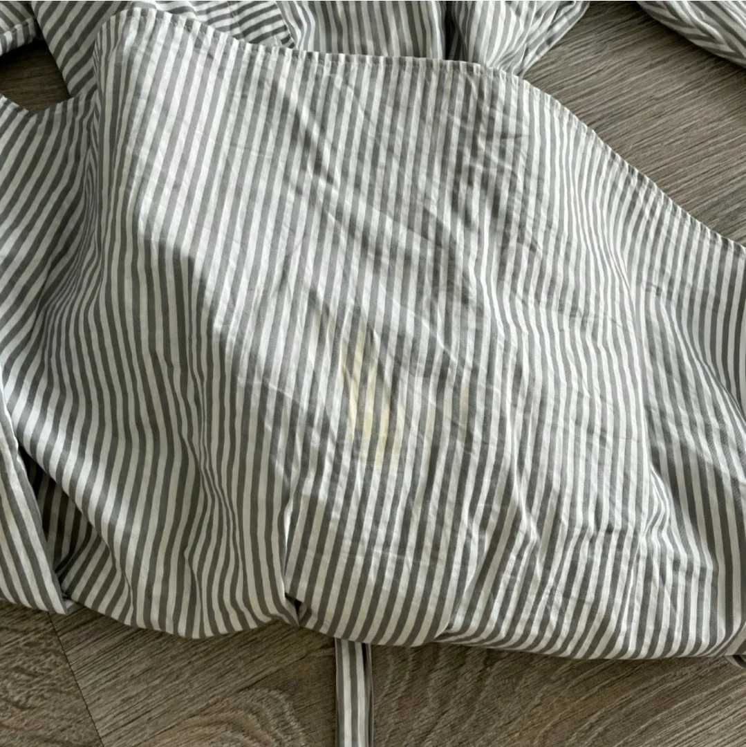 Stain at back as shown, needs a tide to go pen. first 2 pics are of a different colourway, shows how the model fits. fits size small-medium.