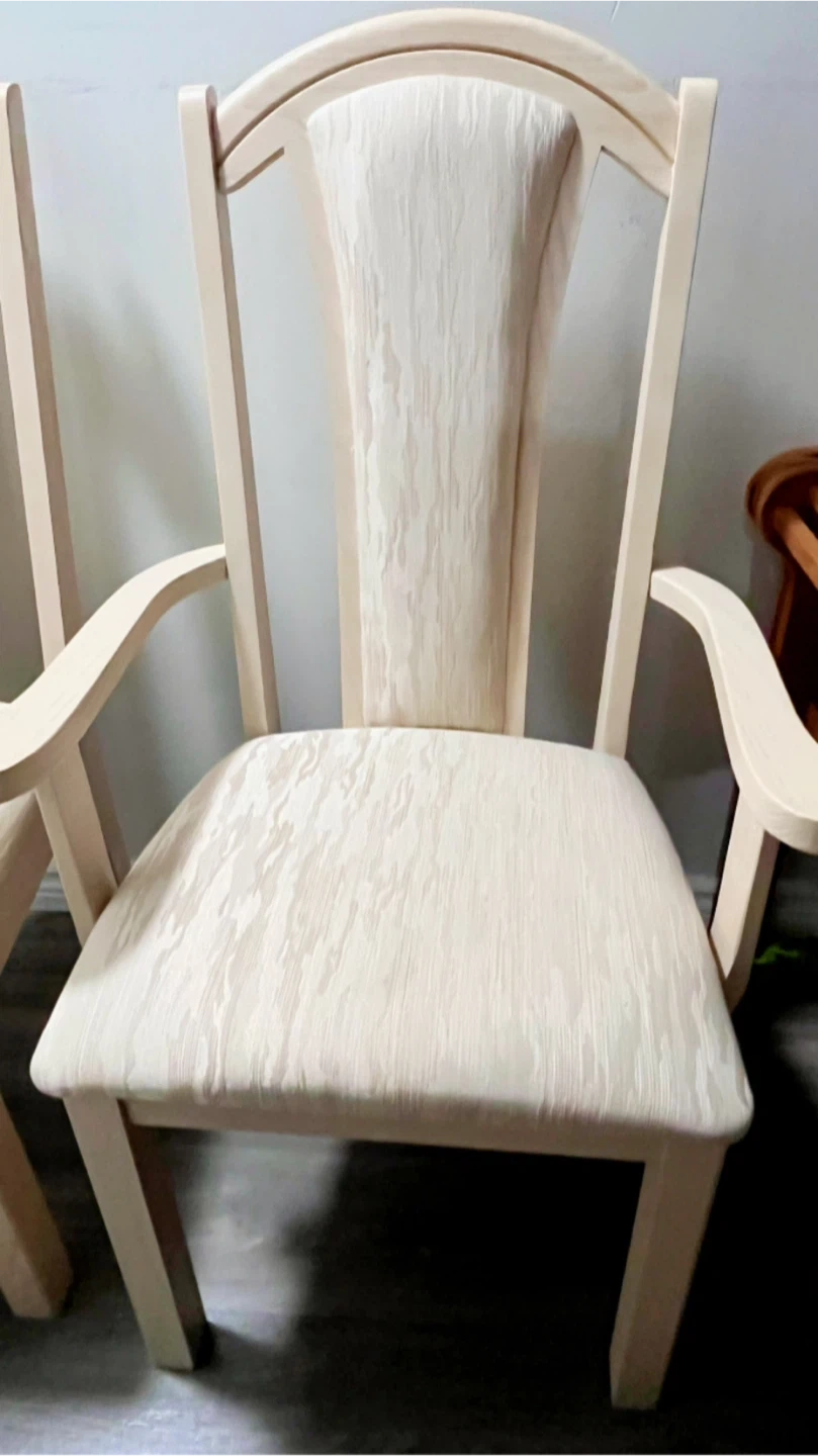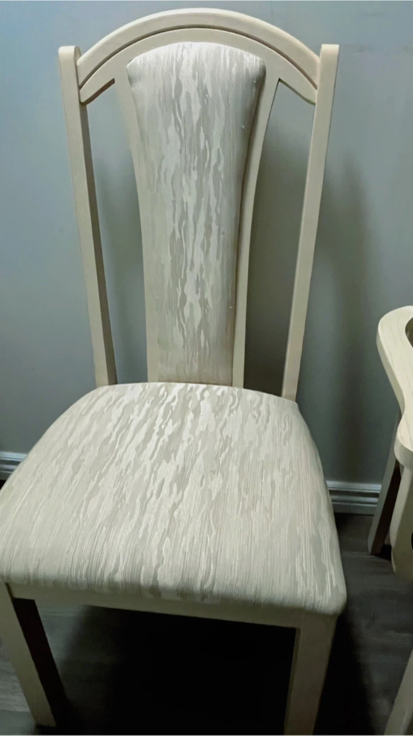 Selling a set of two dining chairs. They have a light wood frame and upholstered seats and backs with a subtle patterned fabric. They are in good condition and would be a nice addition to any dining space!