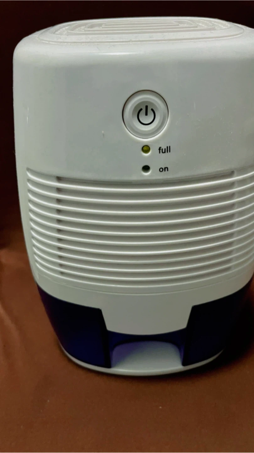Selling a small dehumidifier in white and blue. It has an indicator light for when the collection tank is full, and another to show that it's on. Great for small spaces!
