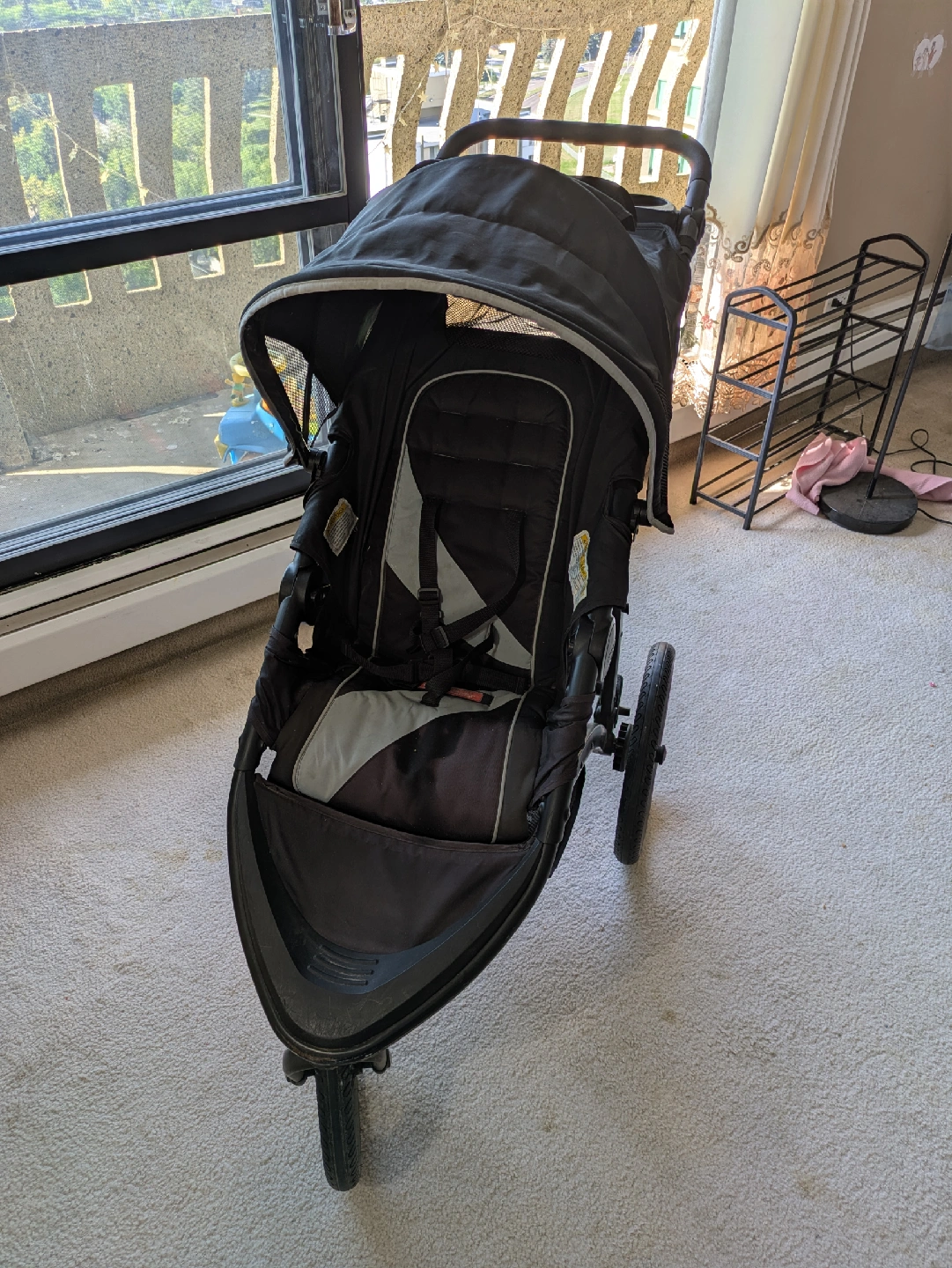 Selling a Graco Fastaction Jogger LX Travel System stroller. It's in great condition and ready for new adventures! The stroller is black and grey and made with polyester fibres and polyurethane foam.