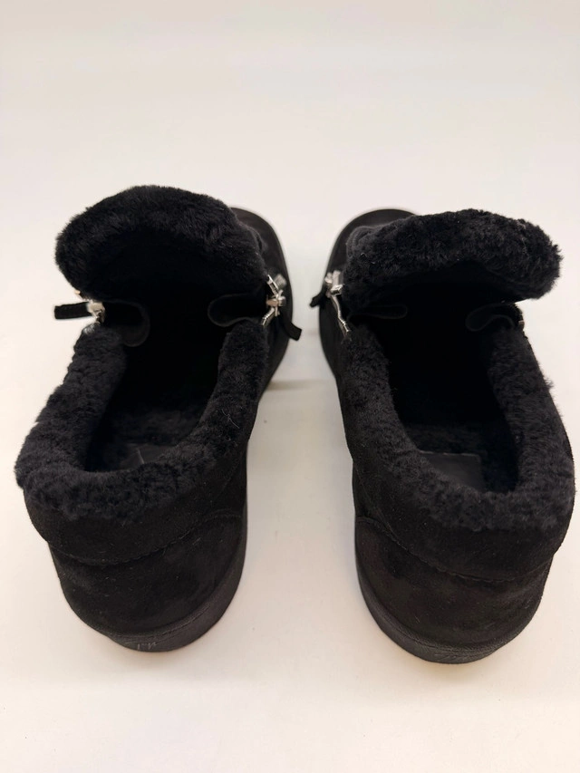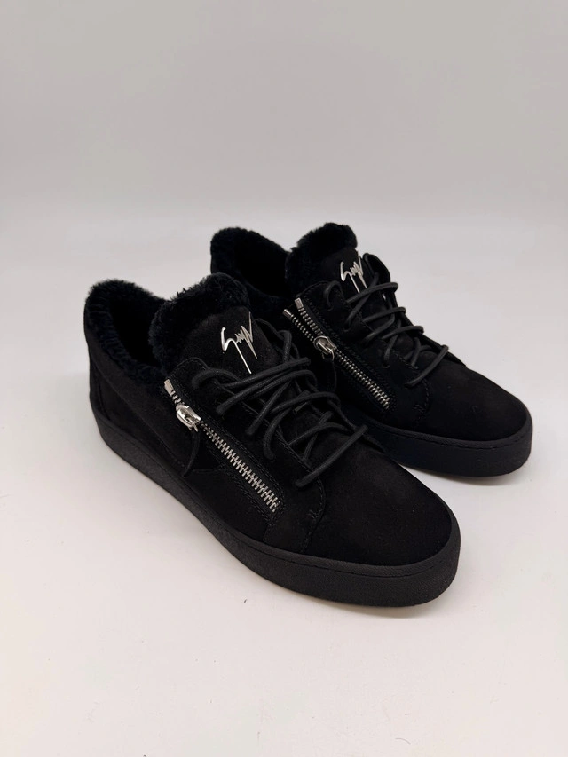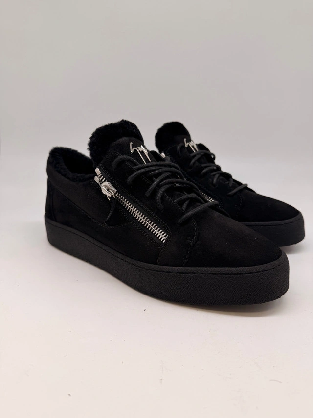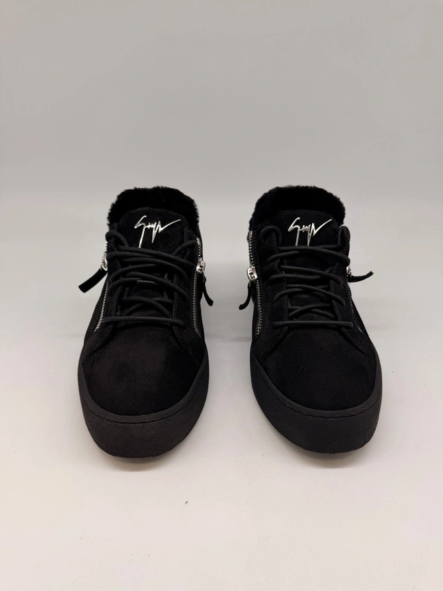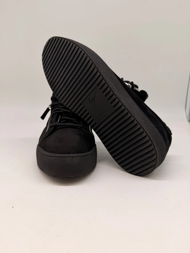 Luxury Giuseppe Zanotti men’s sneakers in black suede with signature silver side zippers and cozy fur lining. Size: 44 EU (≈ US 11) Condition: Gently used, like new (worn very little – see photos) Features: Premium suede upper, lace-up with dual side zippers, fur-lined interior, rubber sole, made in Italy A sleek mix of luxury and streetwear style. Pickup in North York.