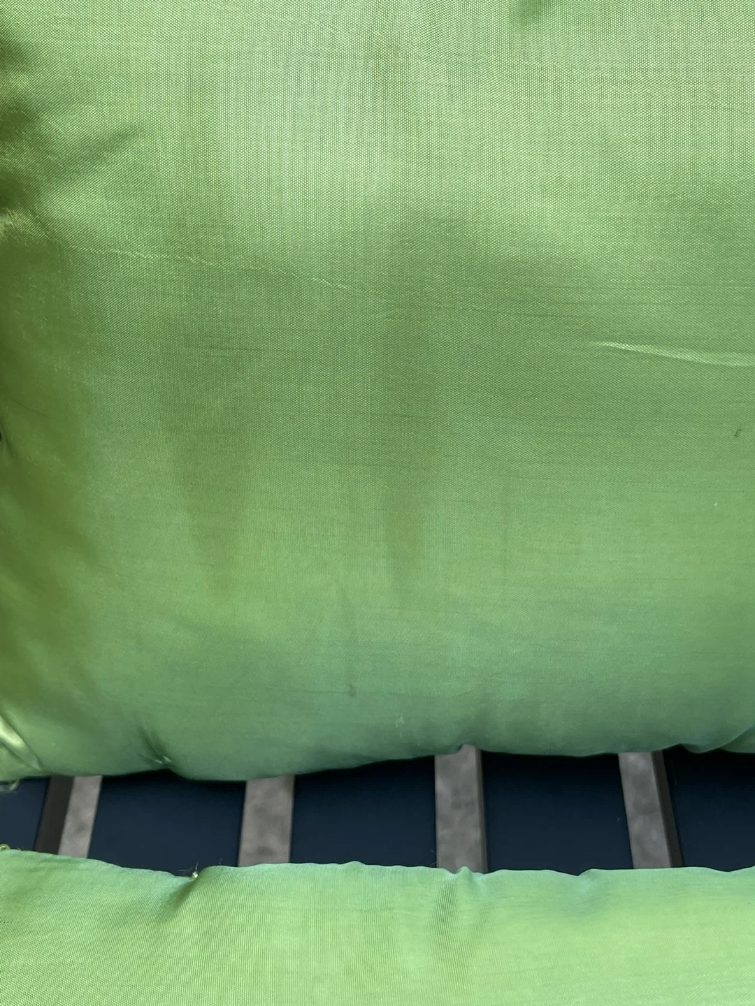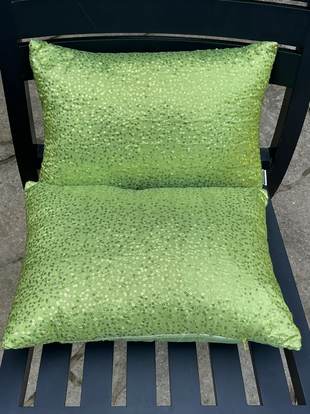 Bright green sequined decorative pillows from Bouclair Good used condition (some marks on the back) $10.00 for both 14”x10” at its widest points Cash only please Smoke free pet free home Mississauga Road and the QEW Meet at 780 South Sheridan Way L5H1Z6