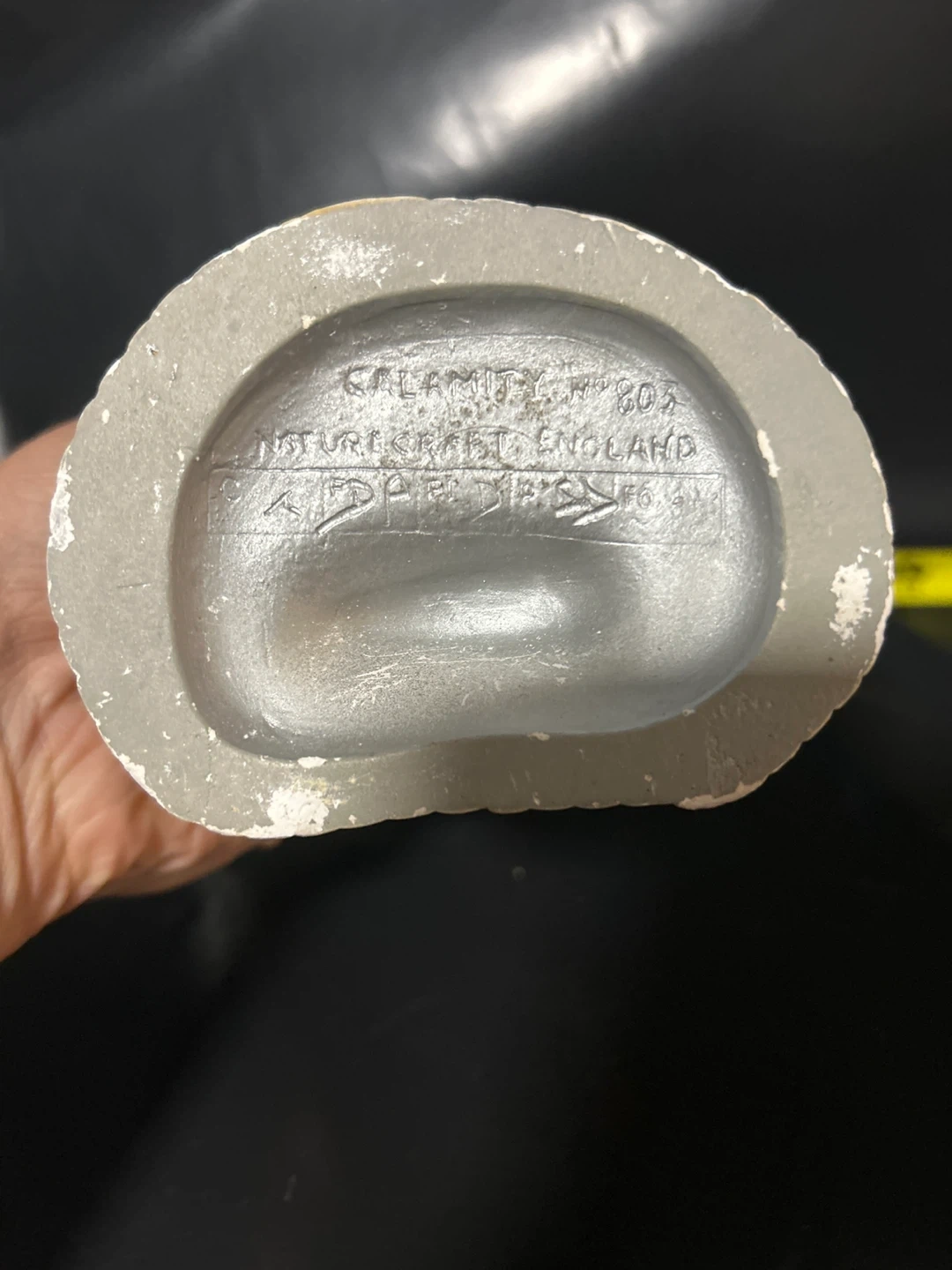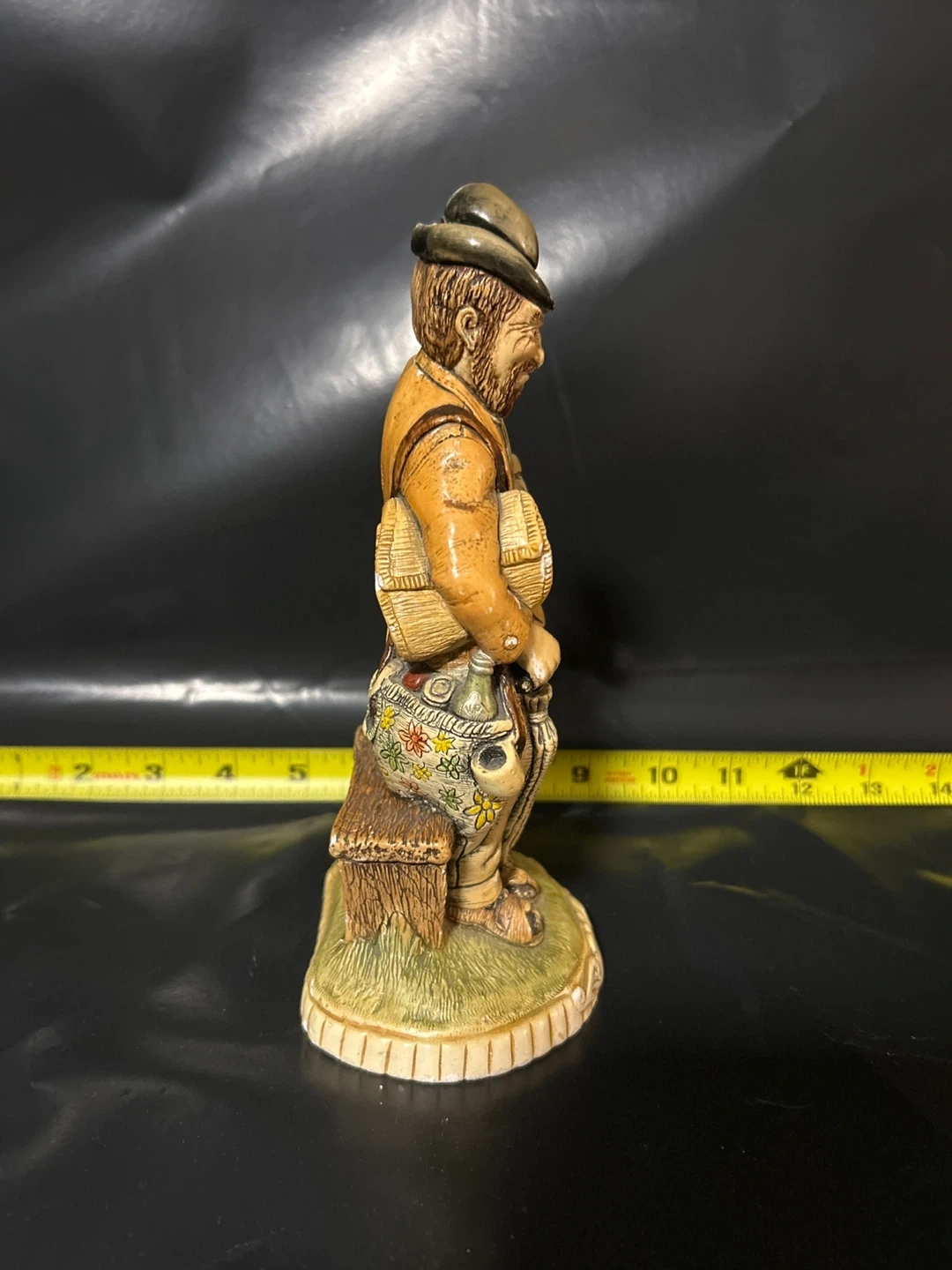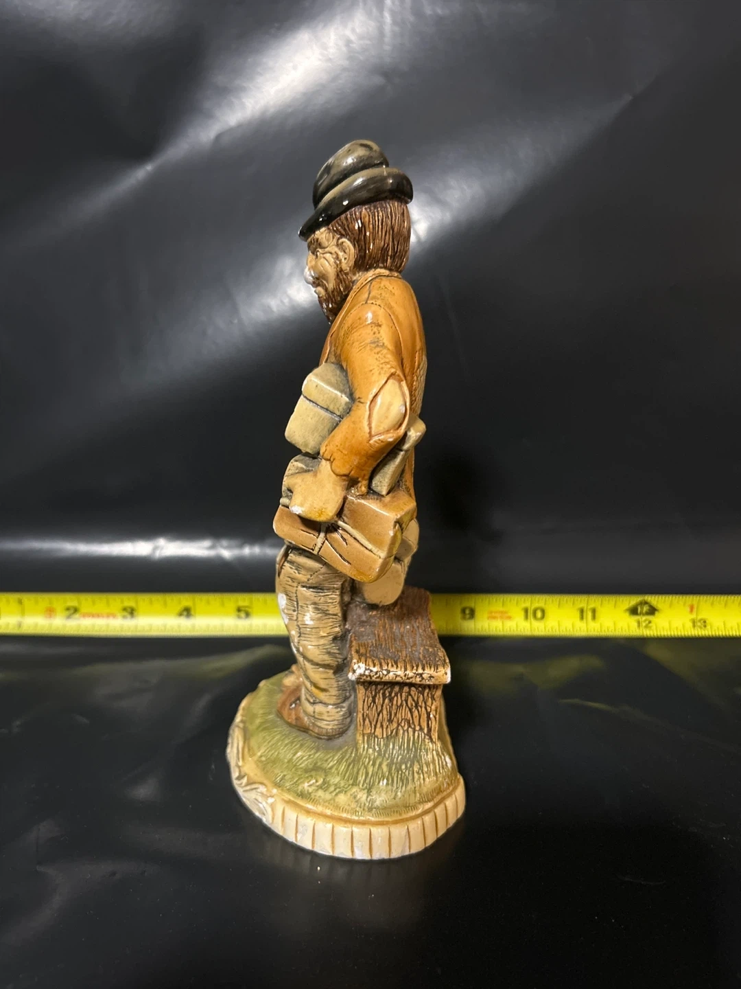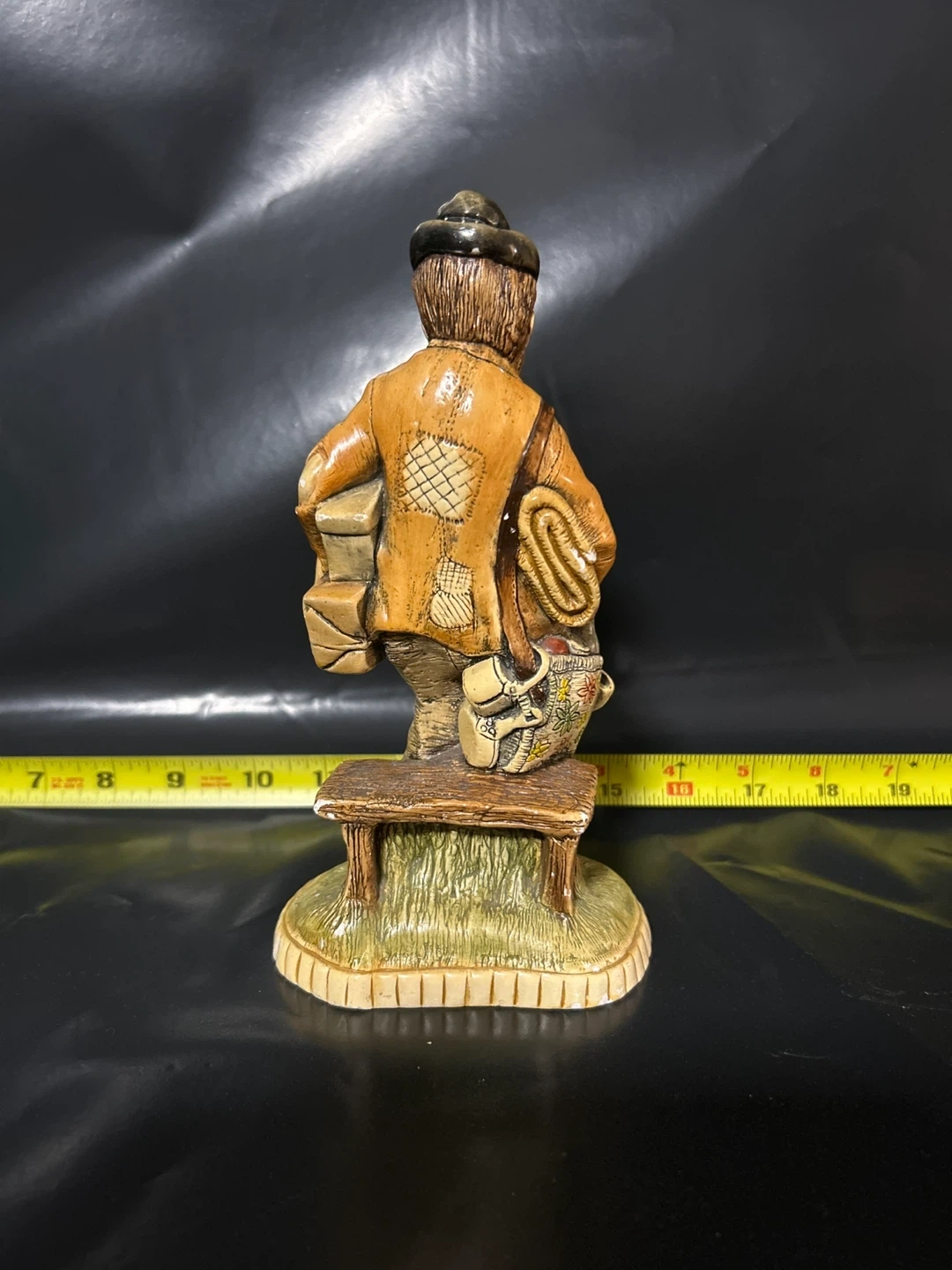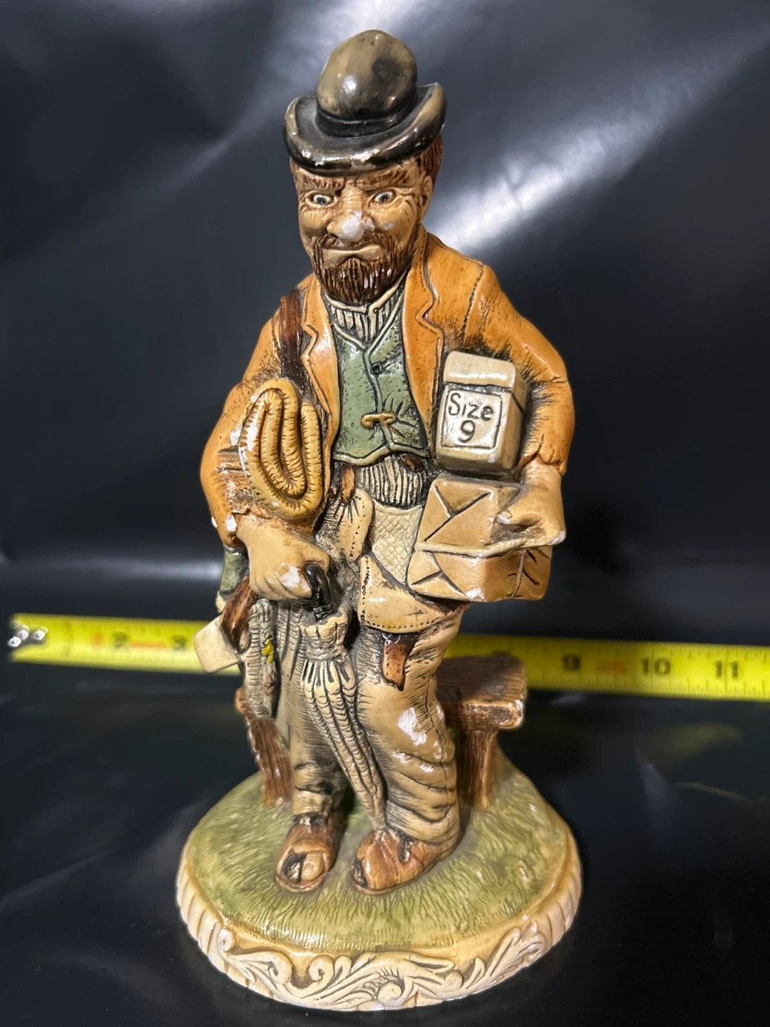 This is a vintage Naturecraft hand-painted stoneware figurine from England, often referred to as a "Calamity" Hobo Clown figurine. Manufacturer: Naturecraft, England. Type: Hand-painted stoneware figurine. Subject: Often depicted as a "Calamity" Hobo Clown. Condition: May show signs of cosmetic wear due to its vintage nature.