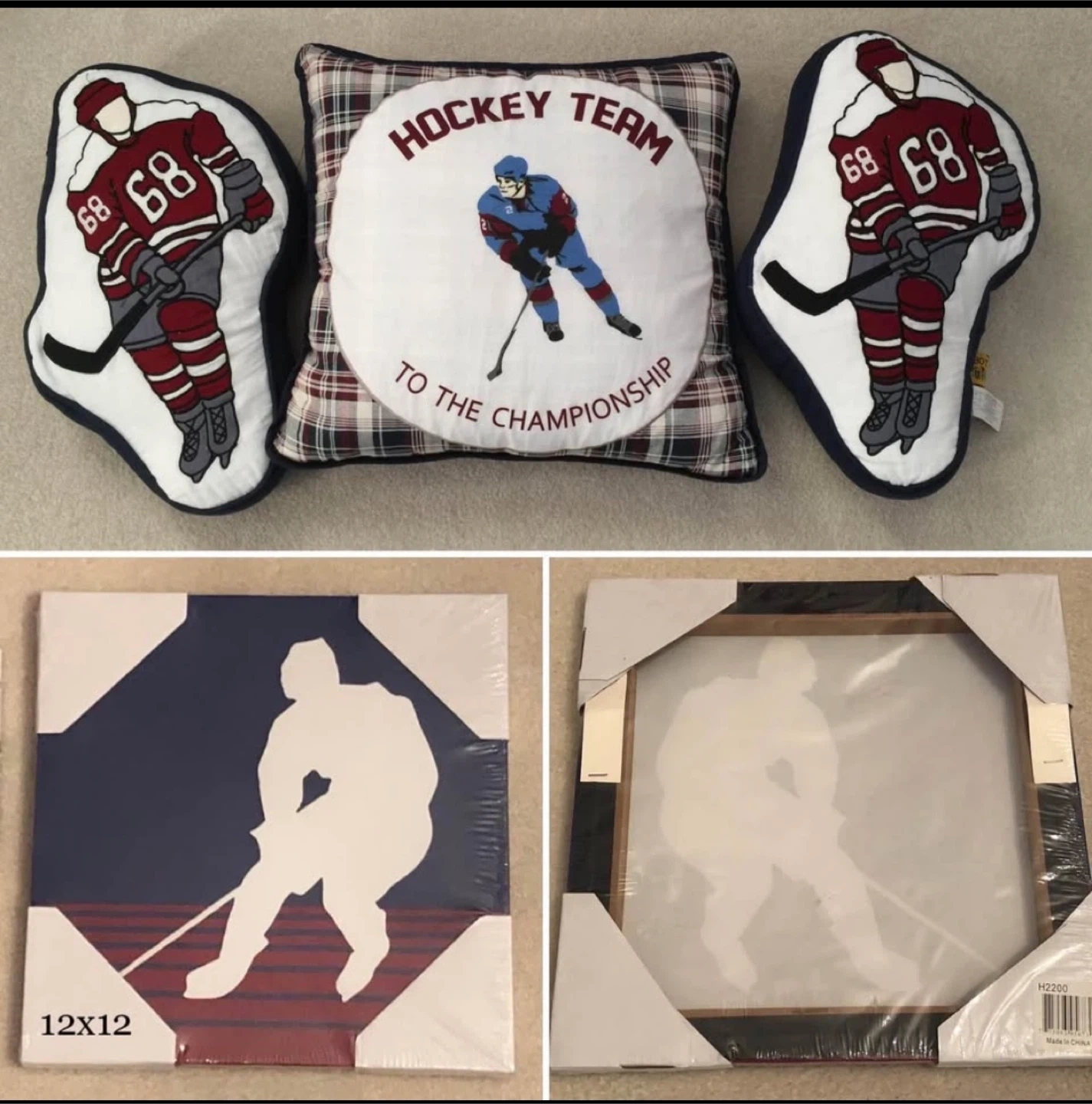 Hockey Themed Room Decor 3 Throw Pillows / Cushions and a 12 x 12 inch canvas wall decor Excellent used condition $5.00 each or $15 for everything Cash only please Smoke free pet free home Mississauga Road and QEW Meet at Tim Horton's/Shell Station 780 South Sheridan Way L5H1Z6 Xposted