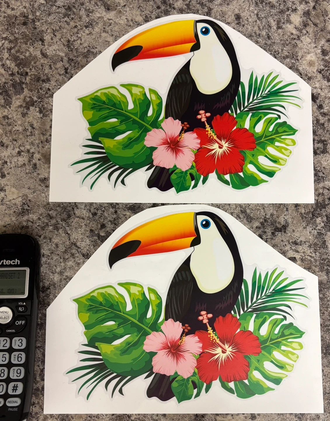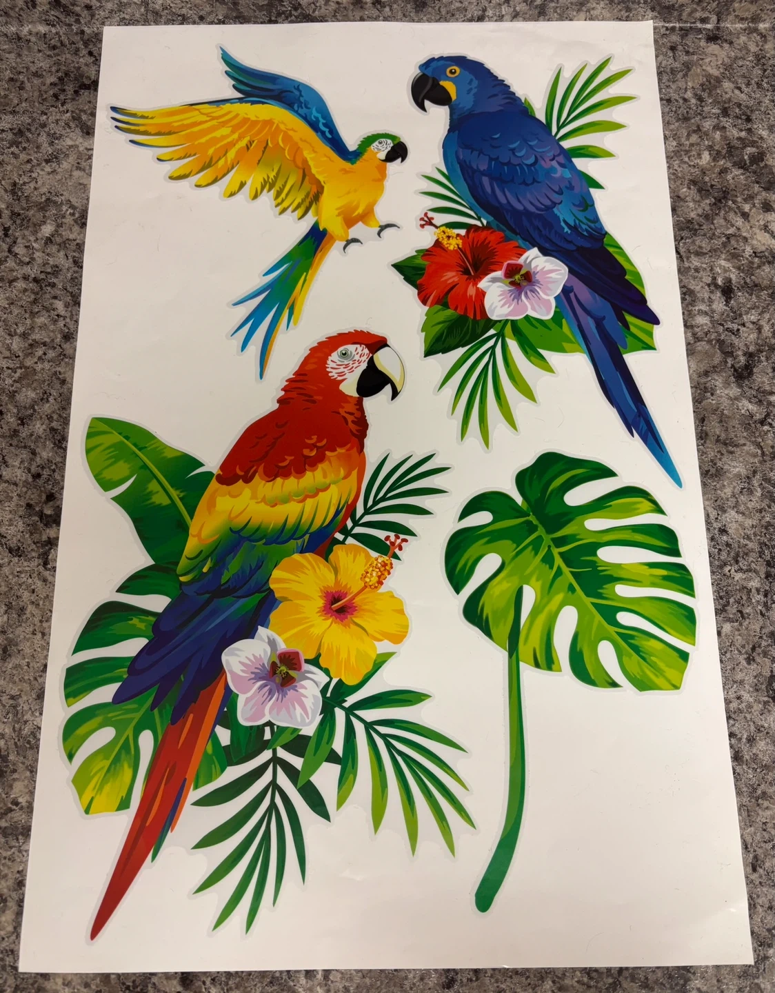 Add a touch of the tropics to your space with these vibrant bird and flower stickers! Perfect for decorating walls, laptops, or any smooth surface. The set includes toucans and parrots surrounded by lush tropical foliage and hibiscus flowers. Brighten up your day with these colourful decals. From Dollarama, just extra ones not used, as is $2.00 Info in photo