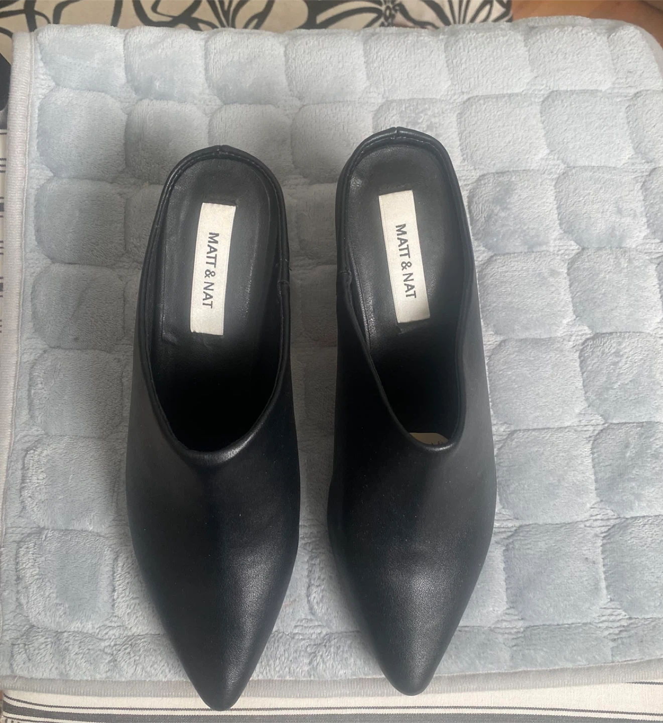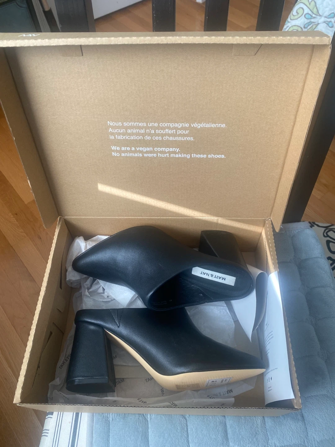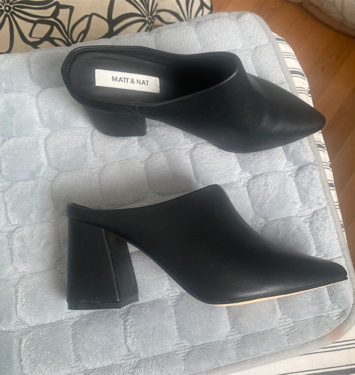Never worn Selling a pair of Matt & Nat mules in size 8! These stylish mules are made with vegan leather and come in classic black. They are brand new and come with the original box! Perfect for adding a touch of sophistication to any outfit