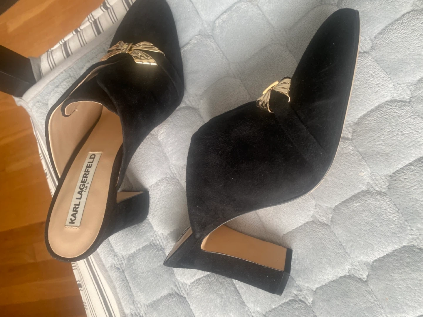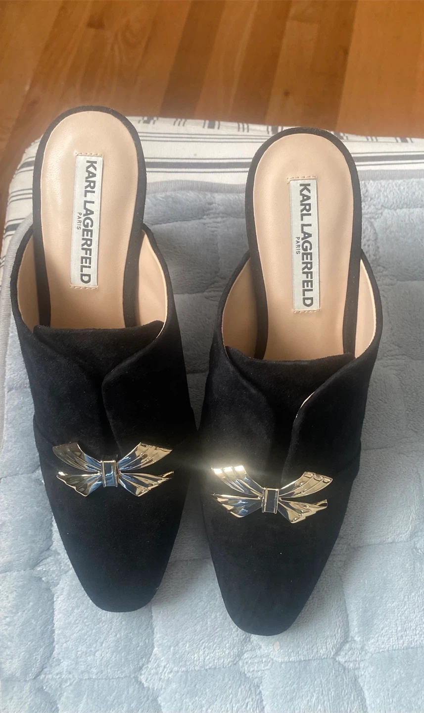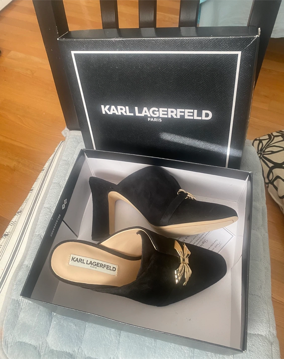 New. Never worn These stylish Karl Lagerfeld mules are in excellent condition and come with their original box! They're a size 8 and feature a sleek black suede finish with a unique gold bow detail. Perfect for adding a touch of elegance to any outfit!