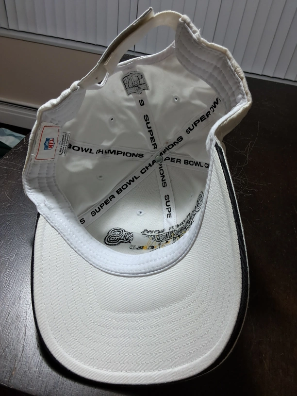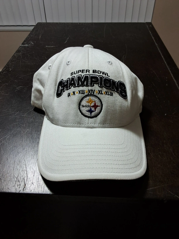 Selling a Pittsburgh Steelers Super Bowl Champions hat. It's white with the team logo and 'Super Bowl Champions' embroidered on the front. The NFL logo is on the back. A great item for any Steelers fan!