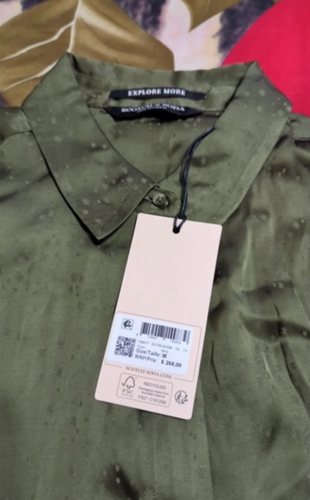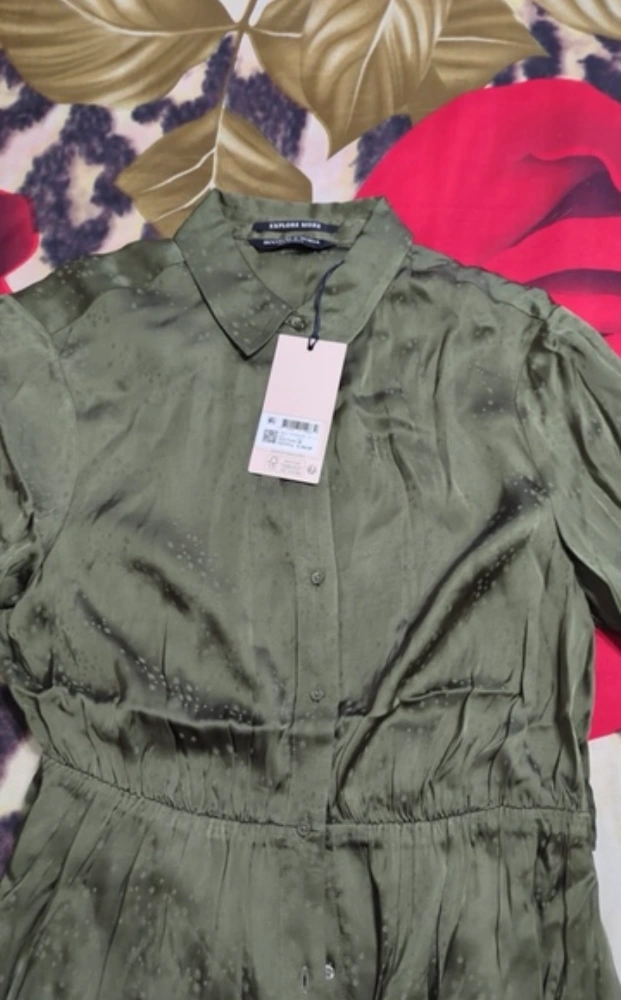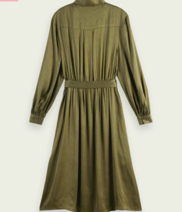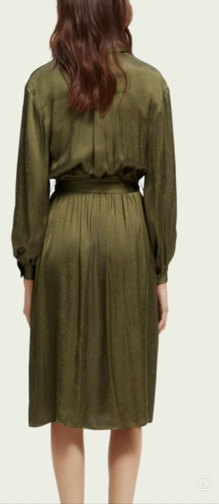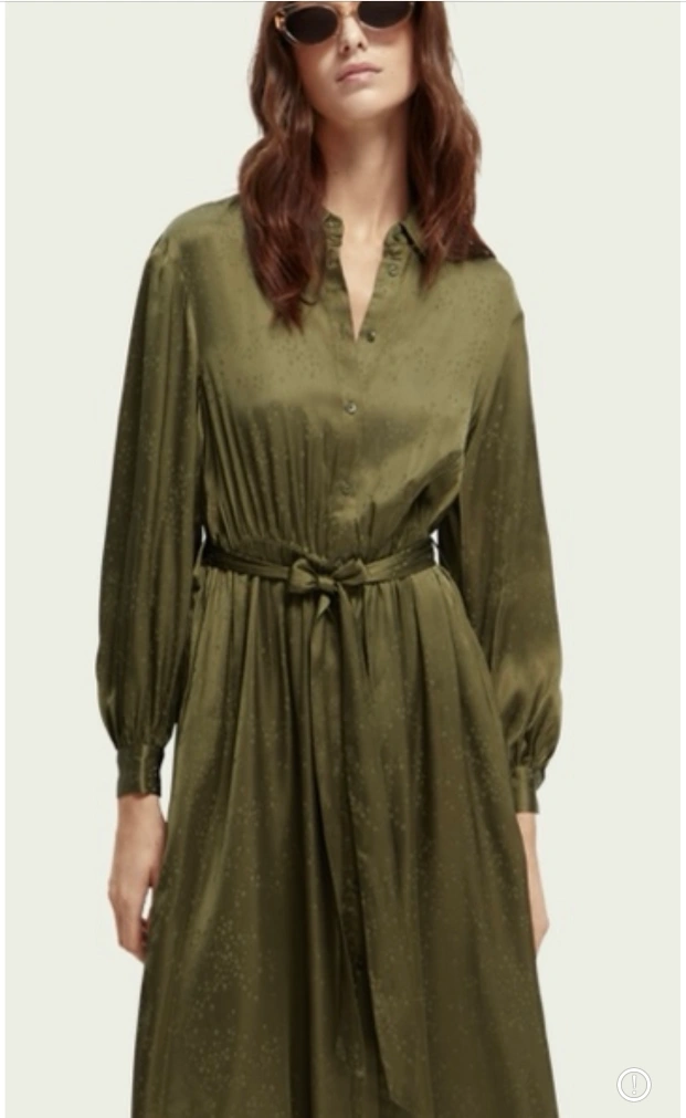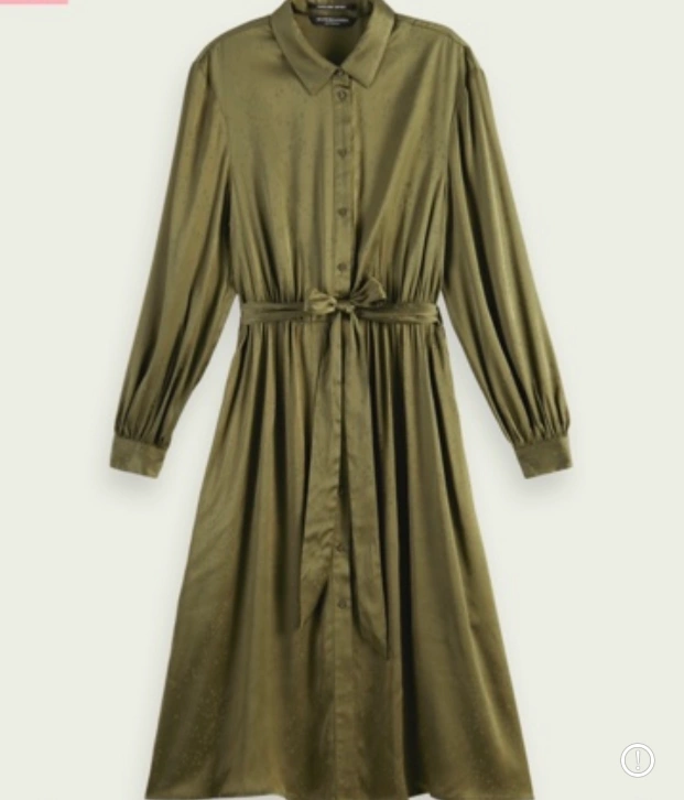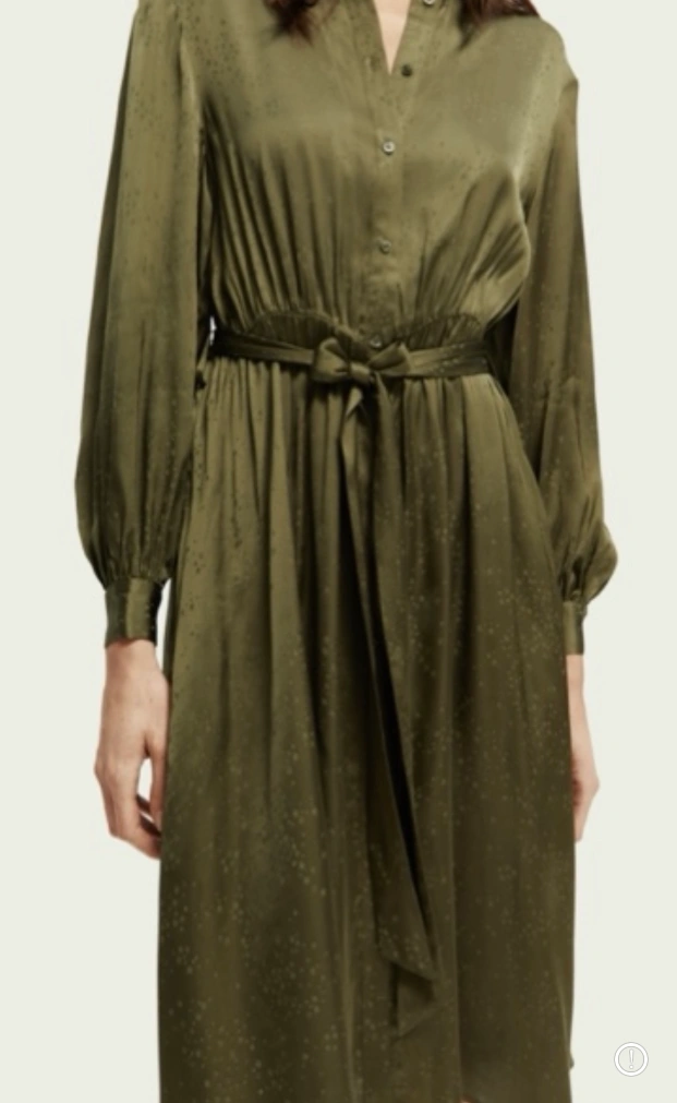 This is a Scotch & Soda olive green midi dress. It features long sleeves, a button-up front, and a tie at the waist. Perfect for a stylish and comfortable look!