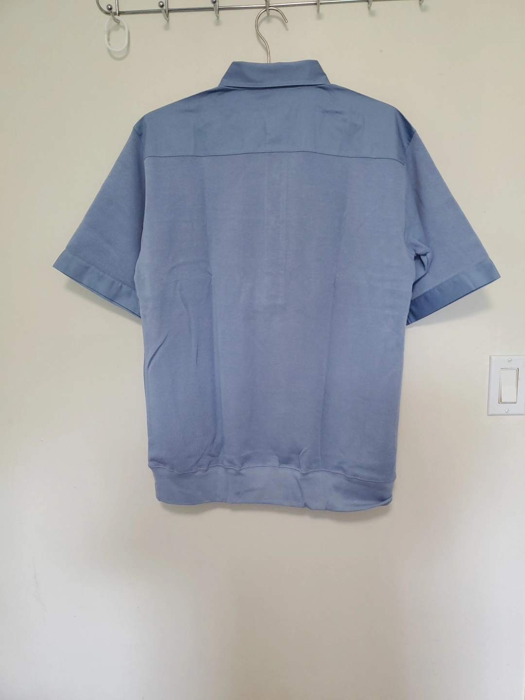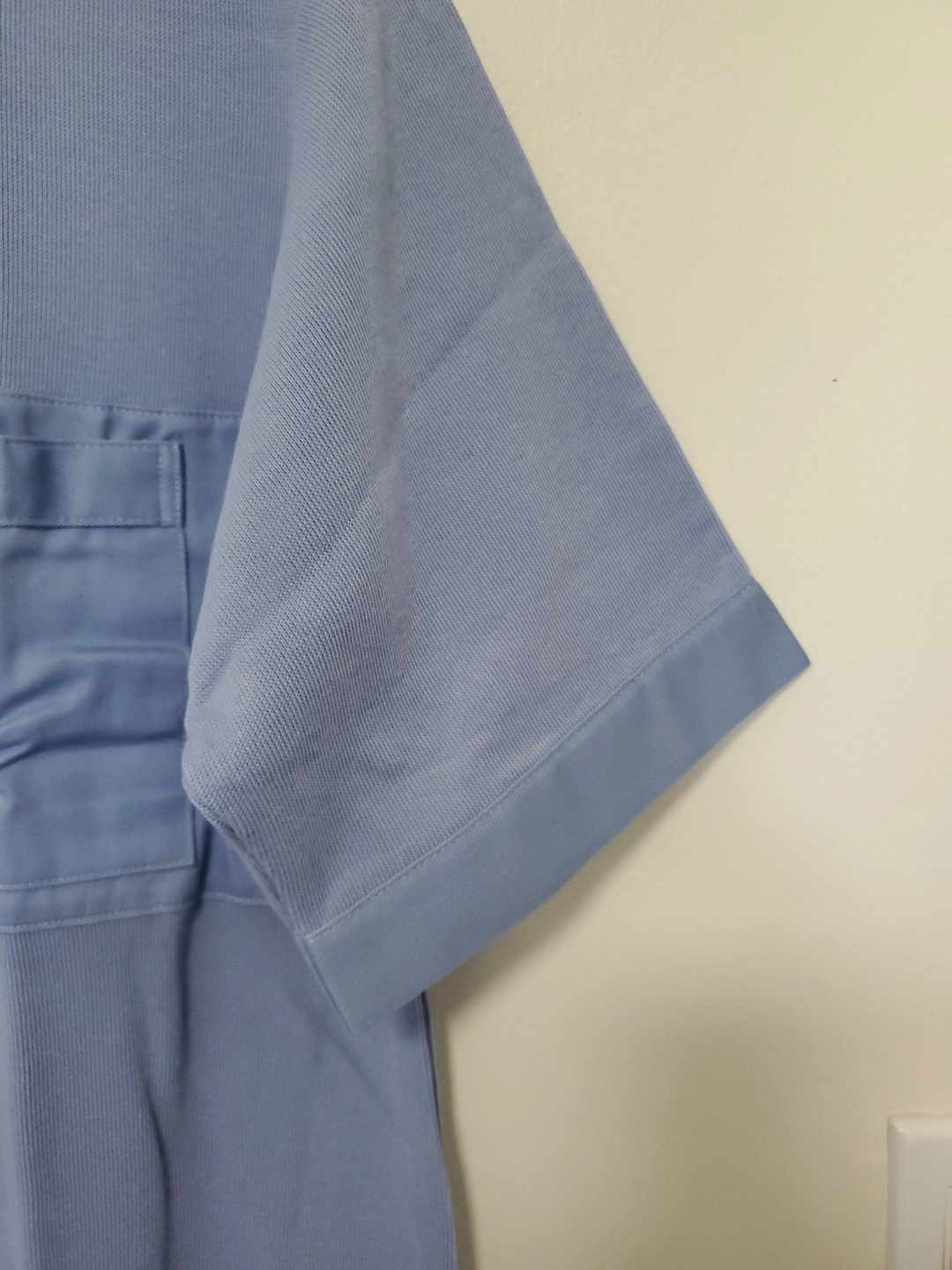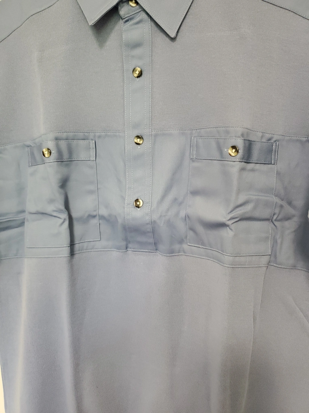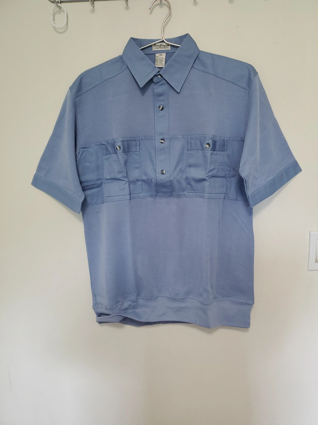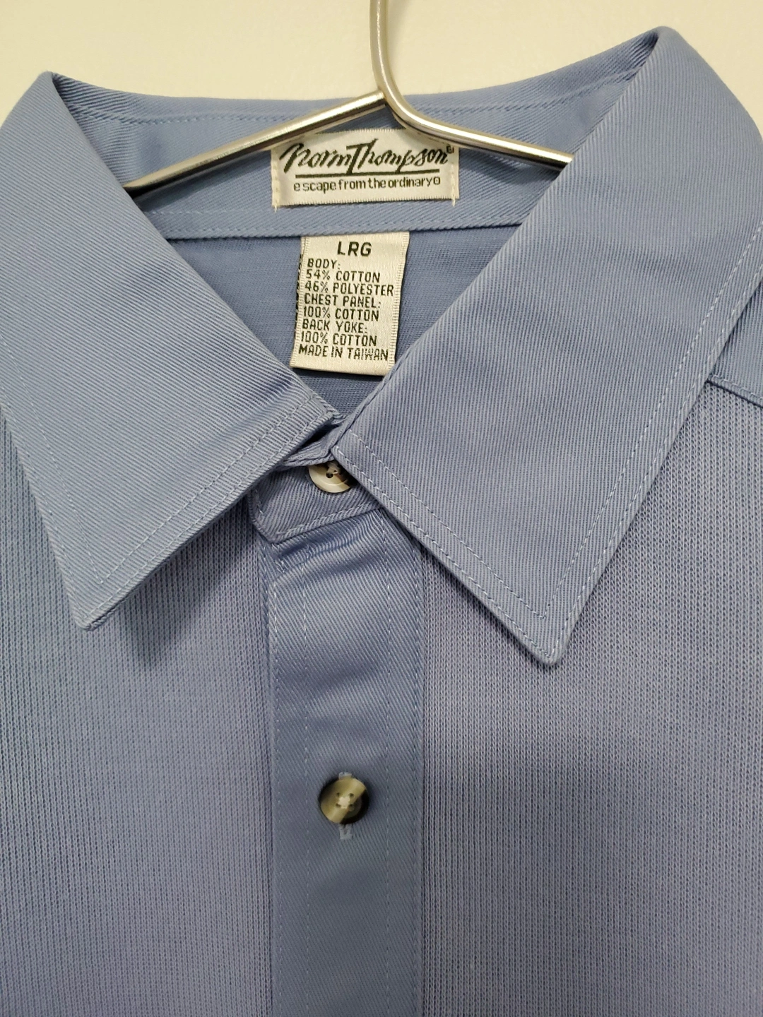 Here's a Norm Thompson short sleeve shirt in size large (LRG)! It's a nice light blue colour and made of 54% cotton and 46% polyester for the body. The chest panel and back yoke are 100% cotton