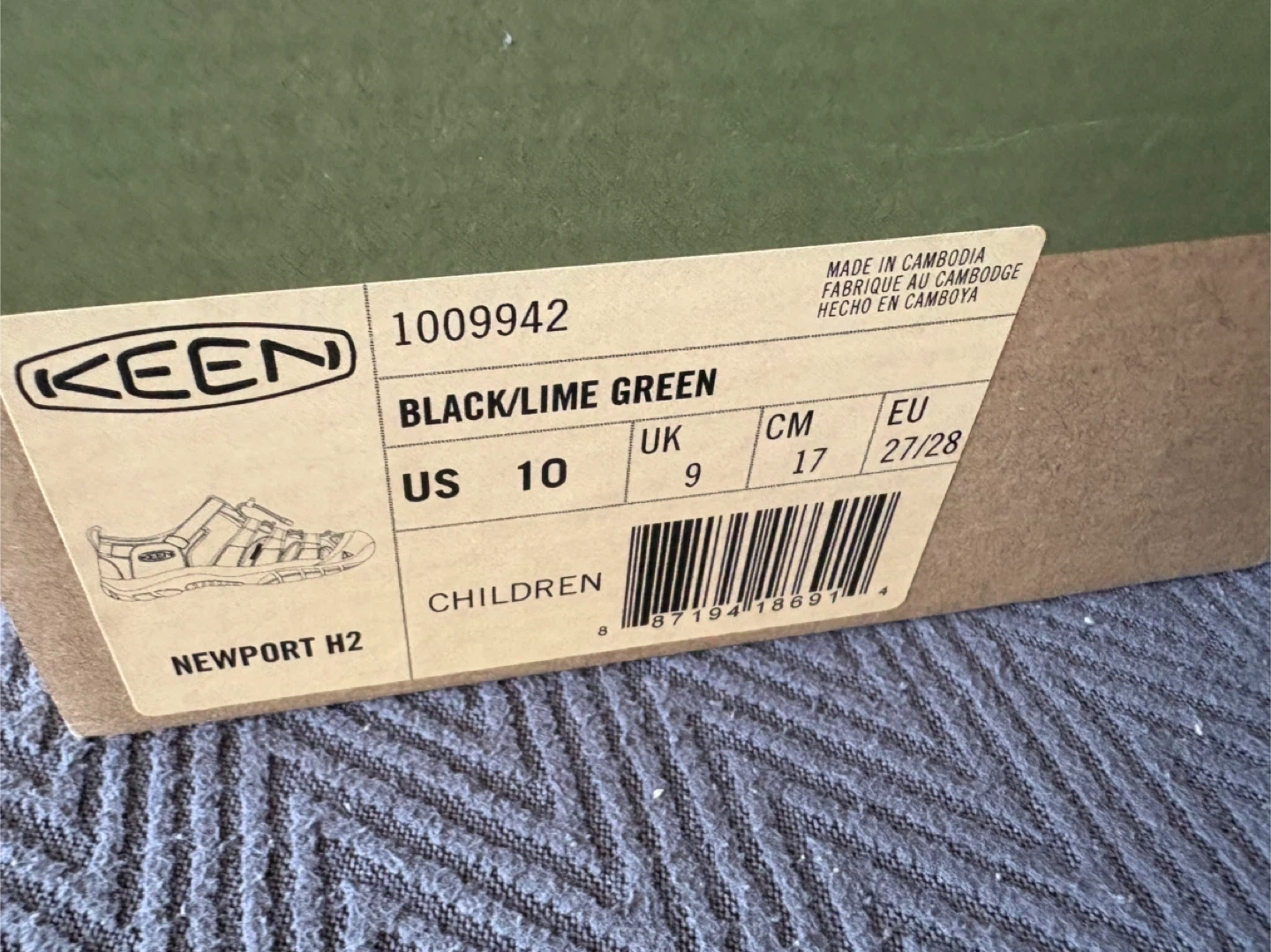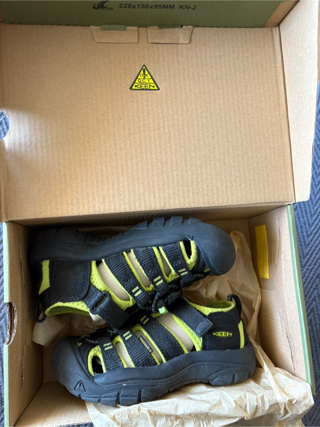 These KEEN Newport H2 sandals are in excellent condition and come with the original box! They are black and lime green and are a US size 10 for children. These sandals are washable, making them perfect for active kids