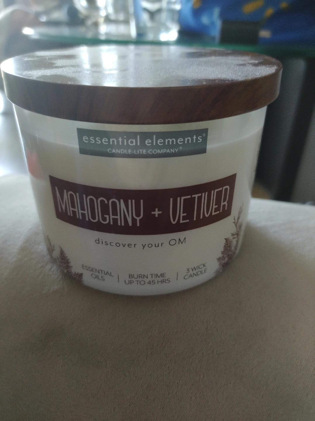 Selling an Essential Elements candle, scented with Mahogany + Vetiver. It's a 3-wick candle, with a burn time of up to 45 hours. Discover your OM with essential oils!