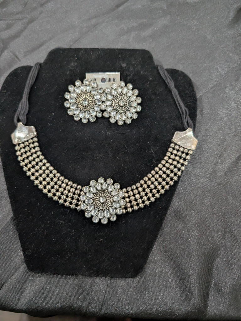Selling a lovely silver-tone necklace and earrings set. The necklace features a beaded design with a floral centrepiece, and the matching earrings have a similar floral design. They're in great condition and would make a beautiful addition to any outfit