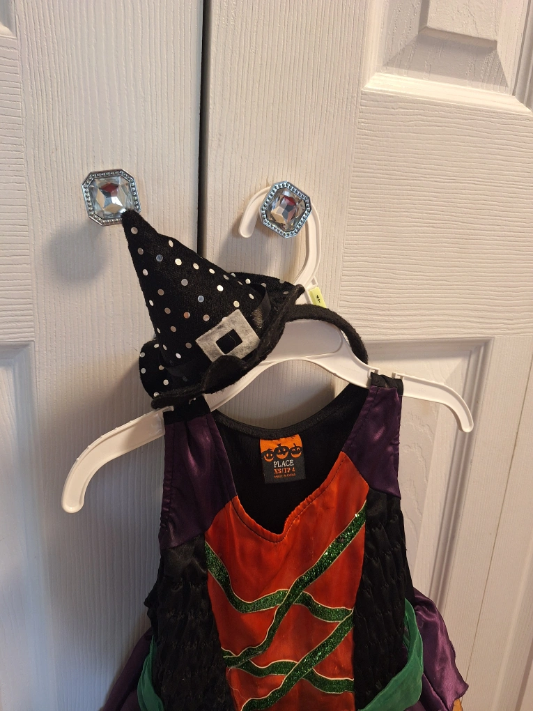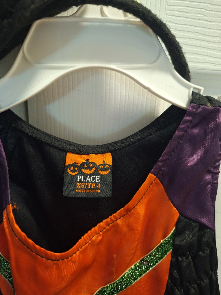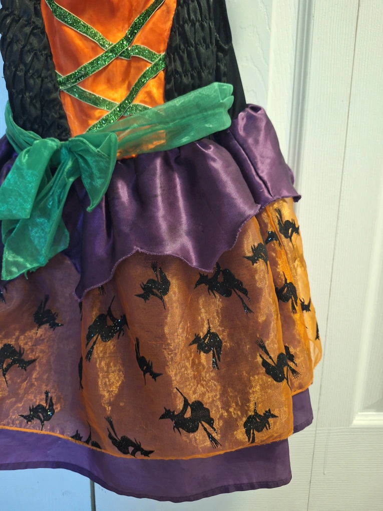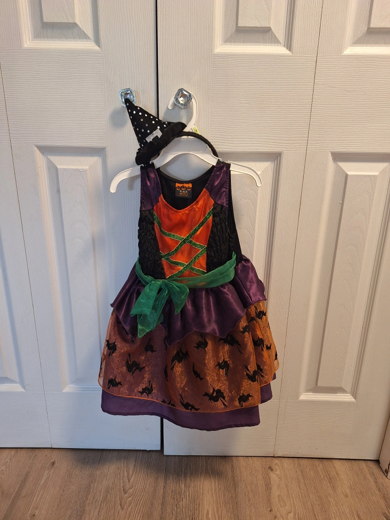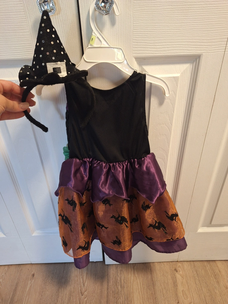 Slip on witch costume with witch hat headband.