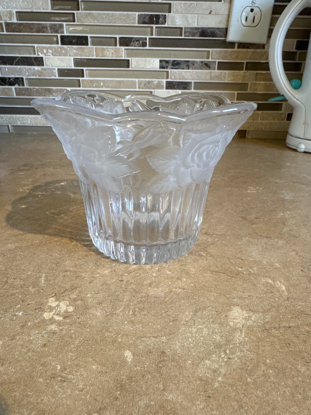 Selling a lovely clear glass vase with a floral etched design. It's in great condition and would look beautiful with flowers or as a decorative piece on its own. A simple and elegant addition to any home!