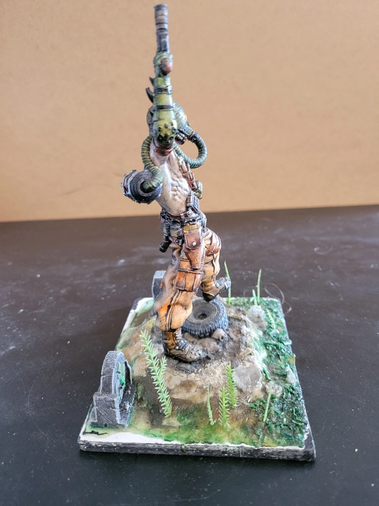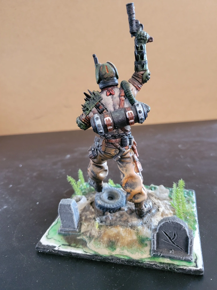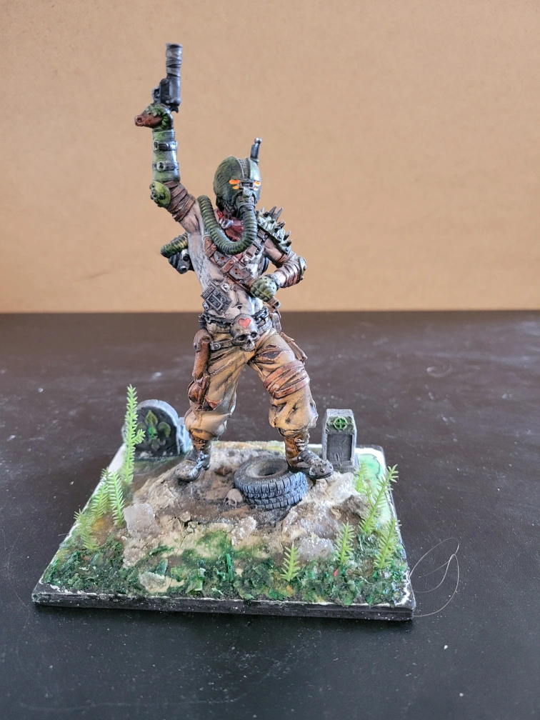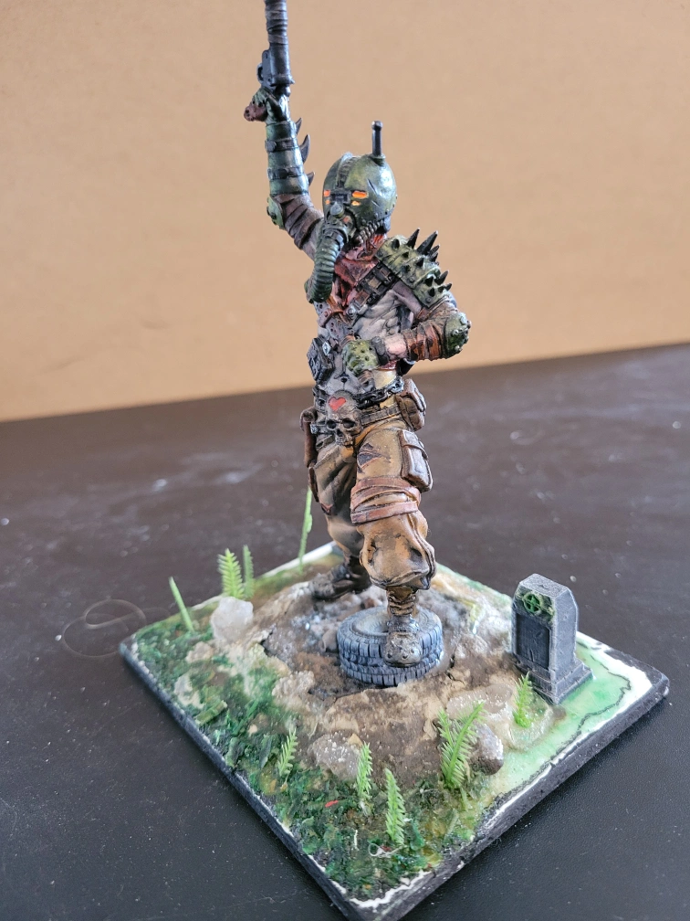 It features a post-apocalyptic diesel-punk marauder. He is equipped with gun and knife, wearing a gasmask. It is standing on a rocky base with tombstones, tires and greenery. It could be a great addition to a collection or for tabletop gaming! Non-smoking household. No drop-offs.