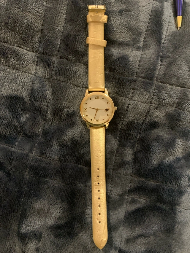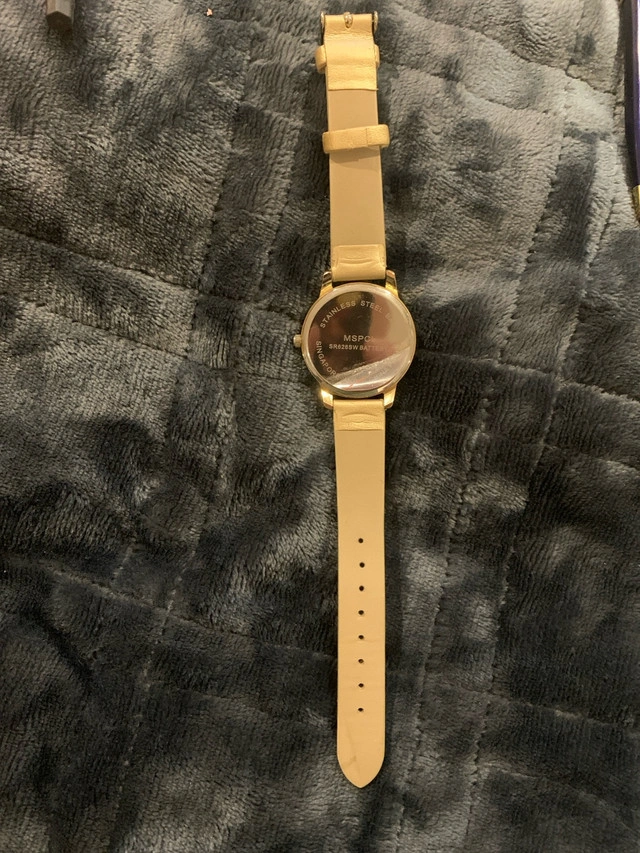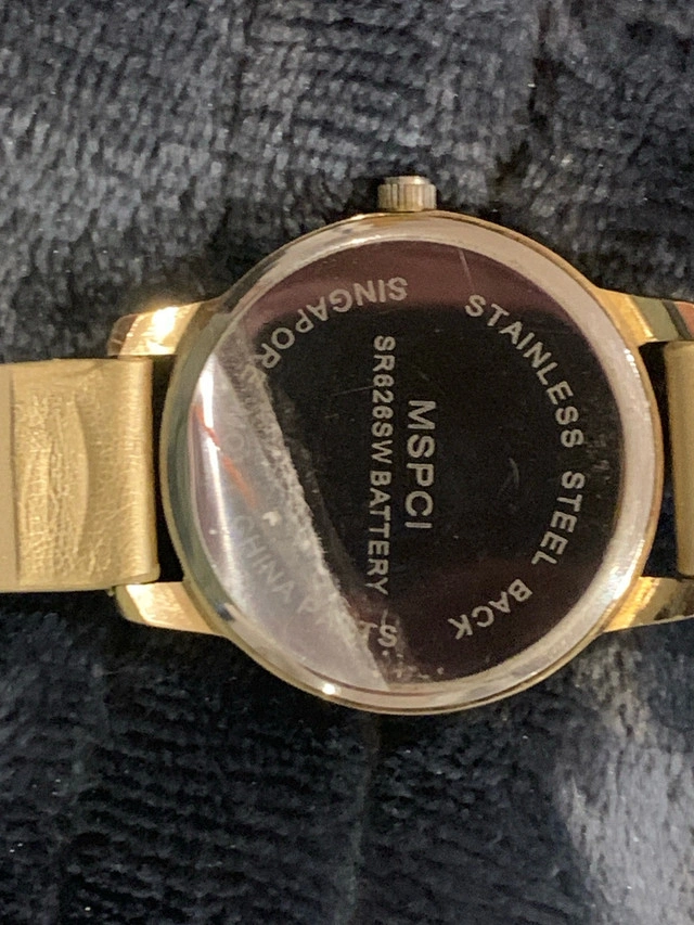 This women’s fashion watch has a bumblebee on the second hand. Watch is running and will come with a battery installed. Wrist strap has some wear, see photos.
