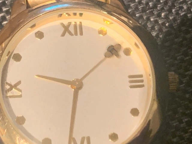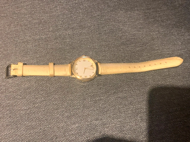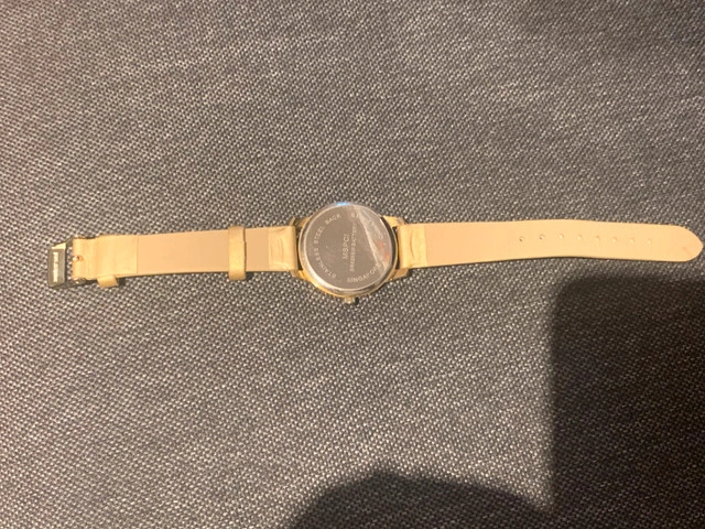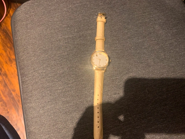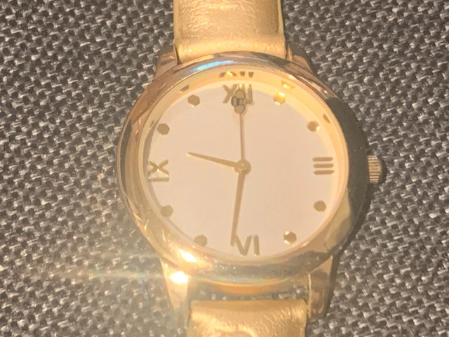 Women’s quartz watch with gold color band. Second hand on the end is a bubble bee. New battery.