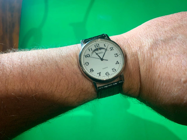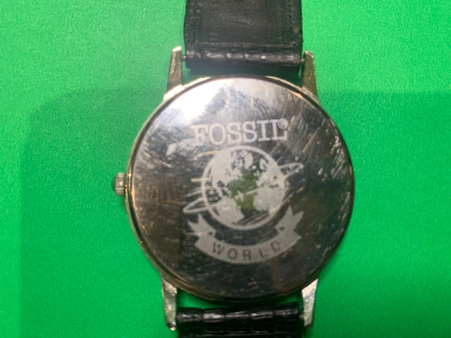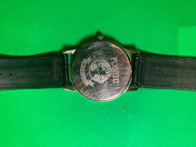 Fossil moonphase quartz watch with new battery. Original leather band in great condition. Ready for Christmas gift giving!