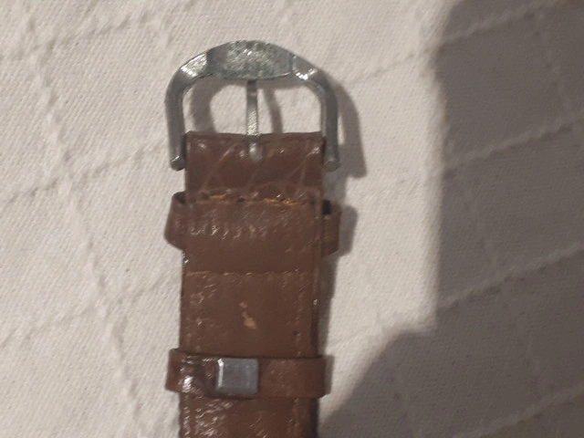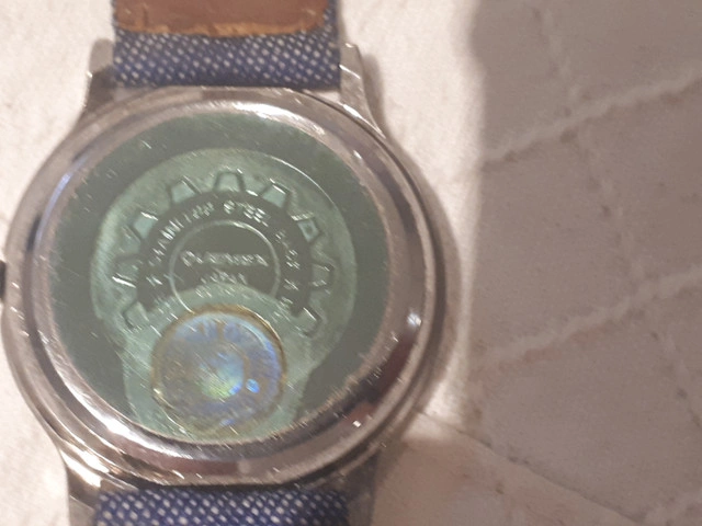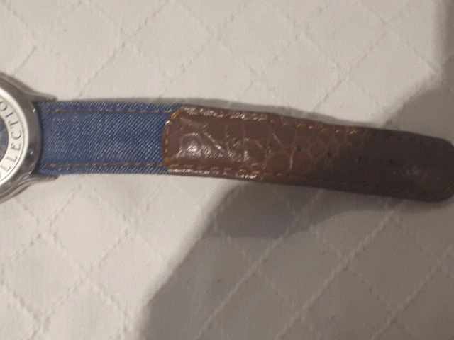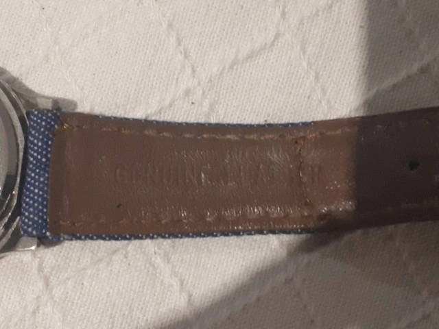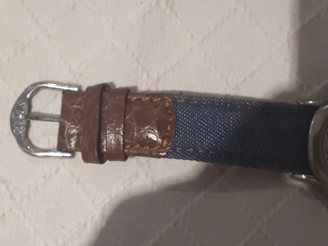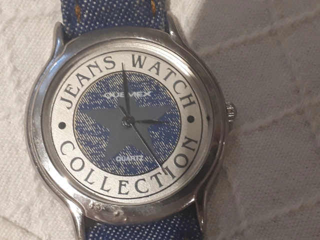 A Quemex watch from the Jean's Watch Collection of the mid 80s. Watch strap is leather with jean material accent. Watch runs and will have a battery installed when purchased.