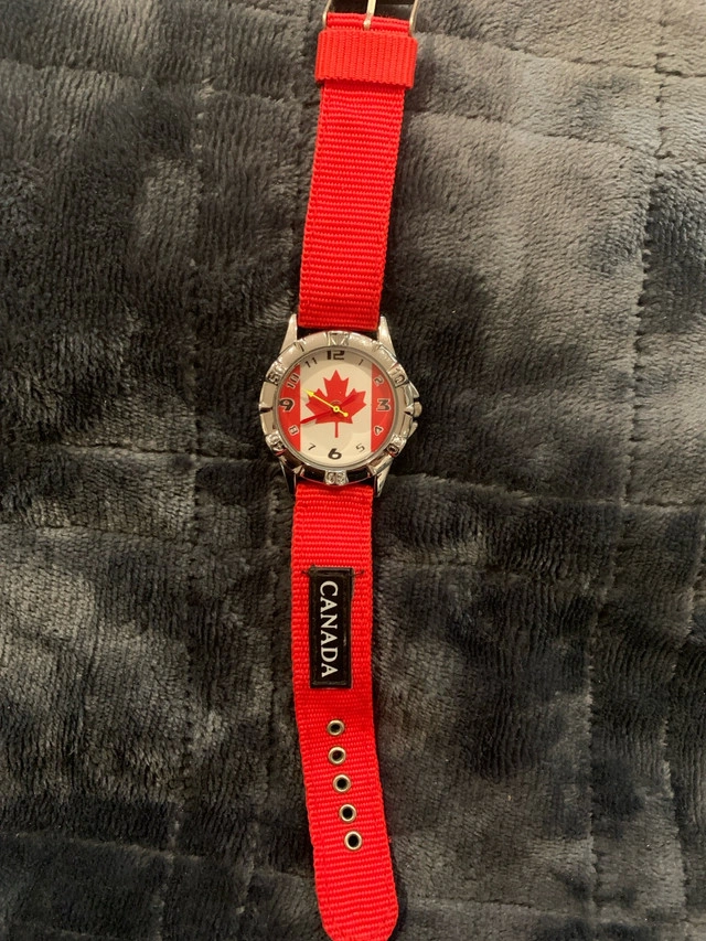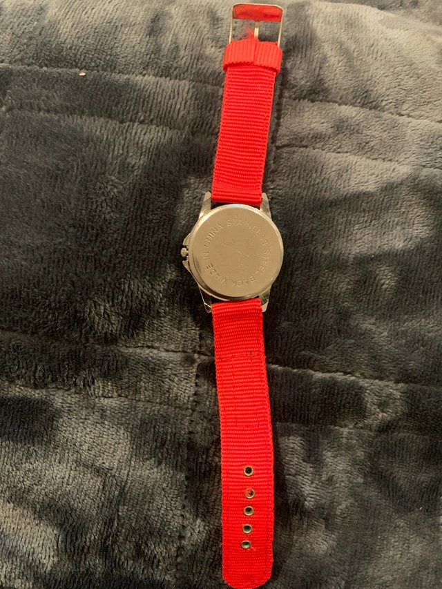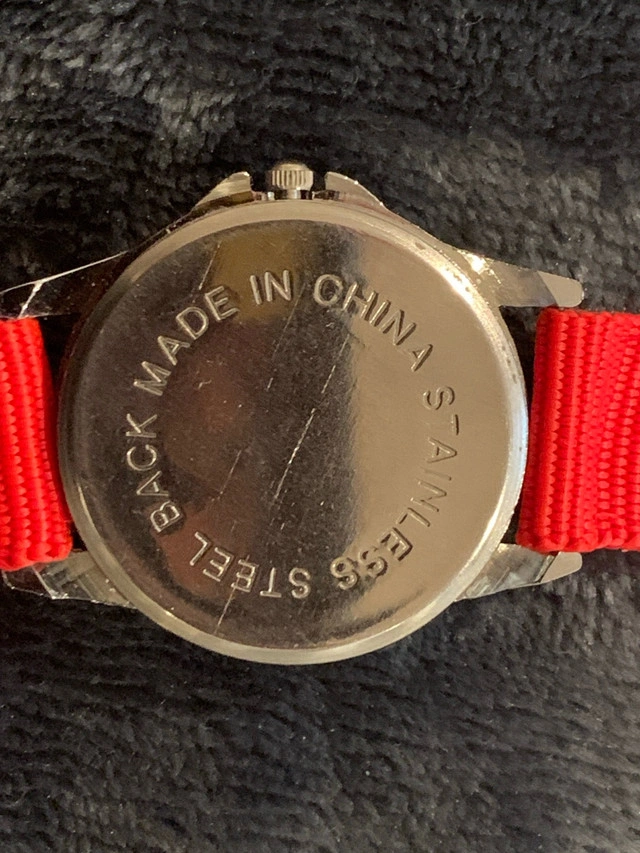Red nylon strap comes with this Quartz Maple leaf watch. Watch is running and comes with a battery installed.