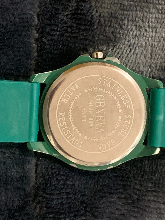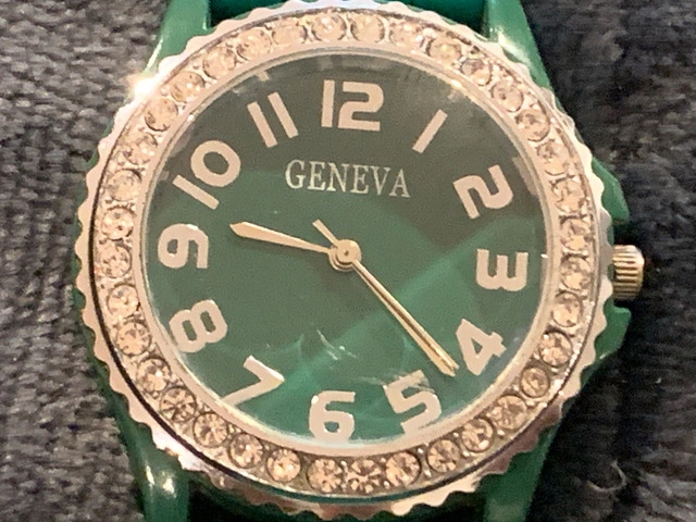 This Geneva Quartz Watch is running and will come with a battery installed. Green silicone wrist strap is like new. Some minor scratches on the crystal.